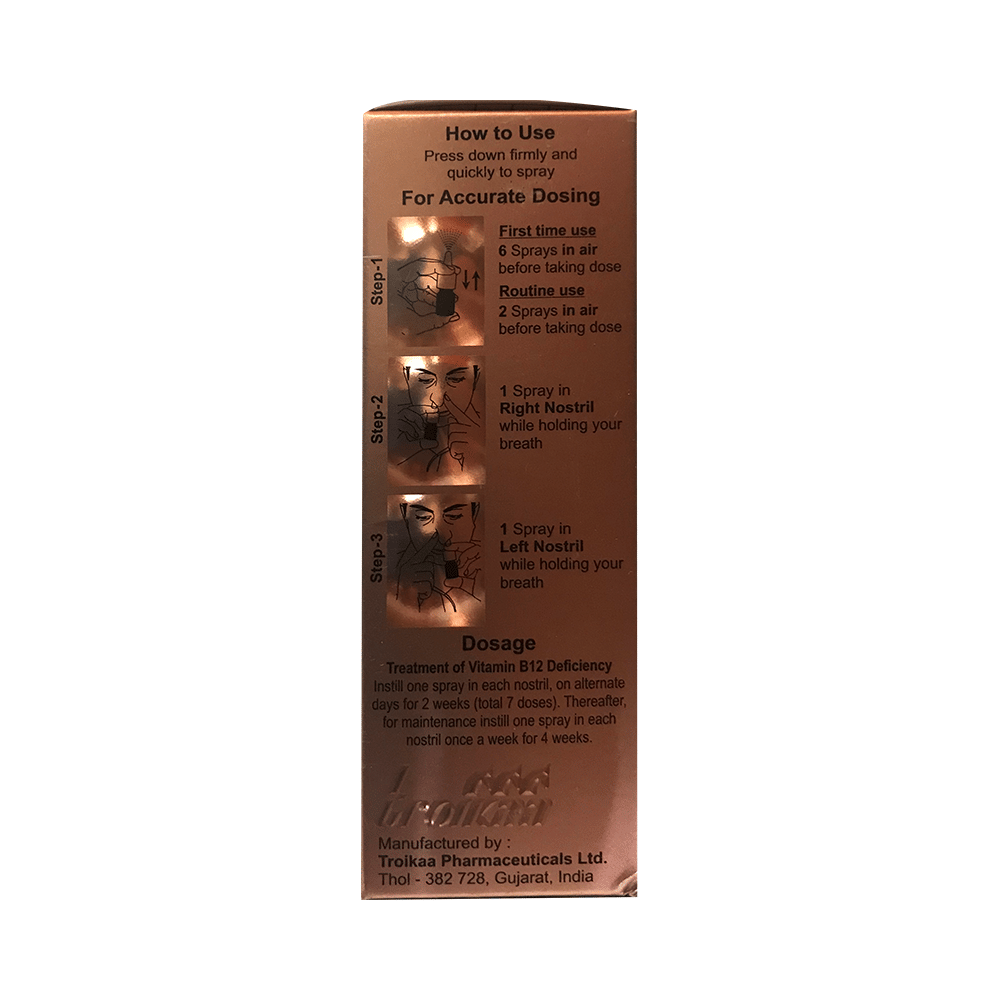 Naso B12 Nasal Spray is a medicine which helps replenish vitamin B12 level in your body. Vitamin B12 plays important roles in the body by keeping the nerves and blood cells healthy. Thereby helping in the treatment of certain anemias and nerve problems. Naso B12 Nasal Spray should be used as you have been advised by your doctor. Do not use it more often or for longer than recommended. Normally you should blow your nose gently before using it, keep one nostril closed while applying the medicine into the other, and then sniff hard to make sure it reaches deep into the nose. Then repeat for the other nostril.It is generally safe with little or no side effects. However, it may cause mild nasal discomfort in some people. Consult your doctor if they persist or if you are bothered by it. Before using the medicine, let your doctor know if you have used a similar medicine before and had an allergic reaction. Before starting to use this medicine you should let your doctor know if you are pregnant or breastfeeding, discuss the risks and benefits with your doctor to make sure it is safe for you.