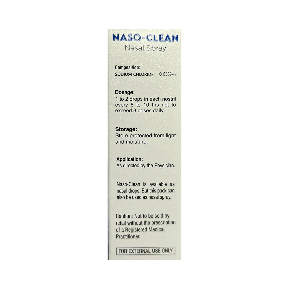Naso-Clean Nasal Spray comprises of purified salt solution. It is used to treat nasal congestion (blocked nose). It moisturizes and loosens the mucus inside of the nose and provides rapid relief from nasal congestion. Naso-Clean Nasal Spray works by moisturizing the inner surface of the nose. It helps in providing relief from stuffy nose due to common cold or allergies. This medicine is for external use only. You should use it in a dose and duration as advised by your doctor.Before using this medicine, check the label. You have to tilt your head as far back as possible. Hold the dropper close to the nose. Make sure that you do not touch the nozzle. Squeeze the dropper gently so that the medicine gets placed in the nose. After few minutes, you can bend your head forward.It is generally safe with little or no side effects. However, it might cause nasal irritation at the time of application. Before using this medicine, inform your doctor if you are on any medication or are allergic to this medication. Also, inform your doctor if you are pregnant or breastfeeding. Please consult your doctor, if you miss any dose.