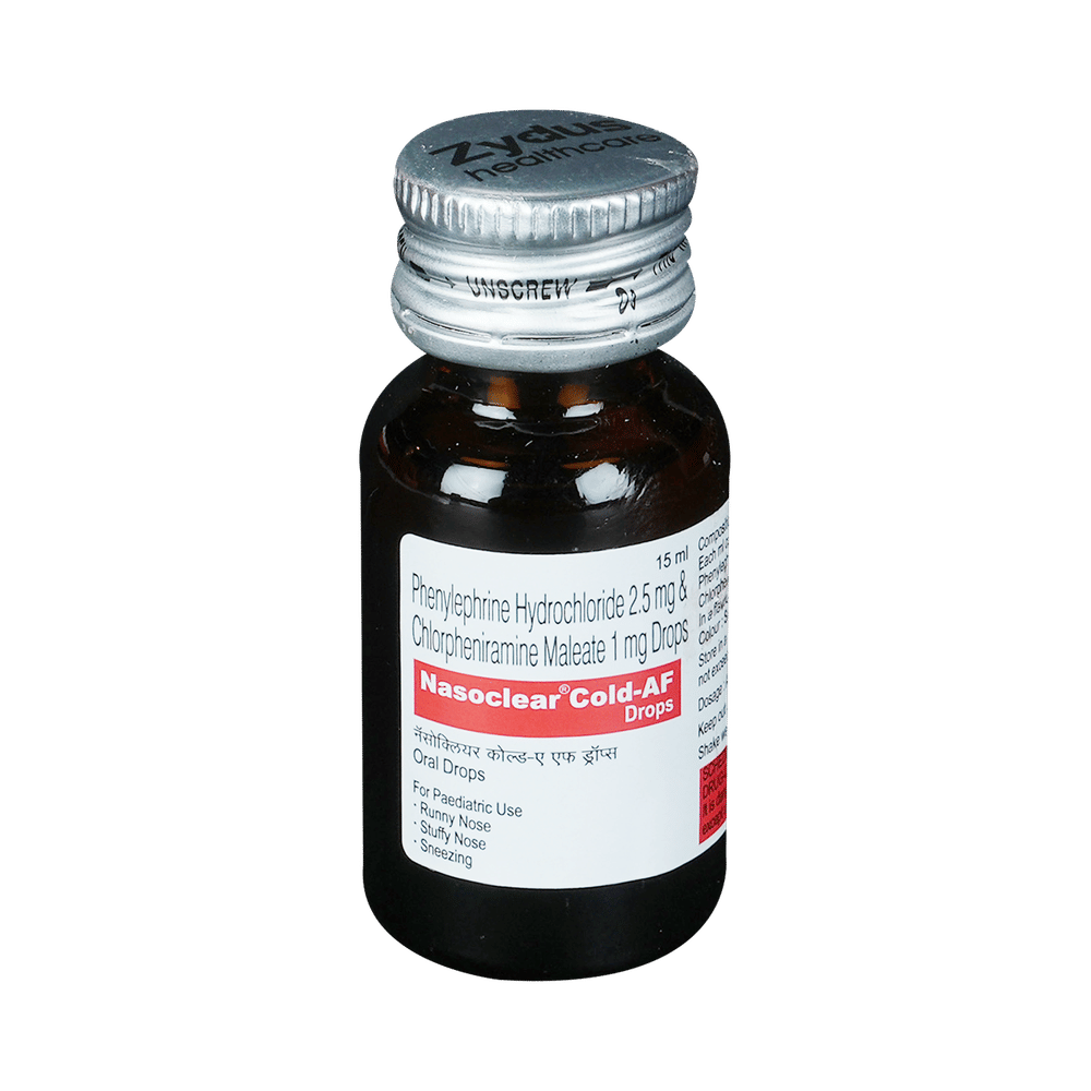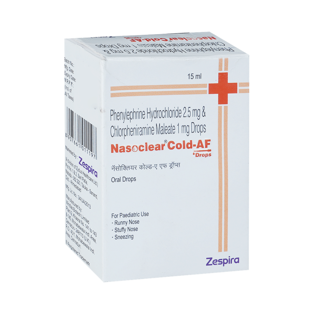 Nasoclear Cold-AF Oral Drops is a combination medicine used for the symptomatic treatment of common cold in children. It helps relieve discomfort caused by a runny nose, blocked nose, and sneezing, allowing the child to breathe more easily and feel better. Nasoclear Cold-AF Oral Drops may be given to your child with or without food. Always follow the exact dose and duration prescribed by the doctor. The dosage will depend on your child’s age, weight, and the severity of symptoms. Do not stop the medicine early, even if your child seems to be feeling better, unless advised by the doctor.Common side effects may include nausea, vomiting, or headache. These are usually mild and temporary. However, if you notice anything unusual or are concerned about how your child is responding to the medicine, consult your doctor promptly. This medicine may also cause drowsiness, so avoid engaging your child in activities that require alertness until you know how it affects them.Make sure your child stays well hydrated while taking Nasoclear Cold-AF Oral Drops. Inform your doctor if your child has any history of liver or kidney problems, as the dose may need to be adjusted accordingly.Note: As per the Ministry of Health and Family Welfare, Nasoclear Cold-AF Oral Drops should not be used in children below 4 years of age.