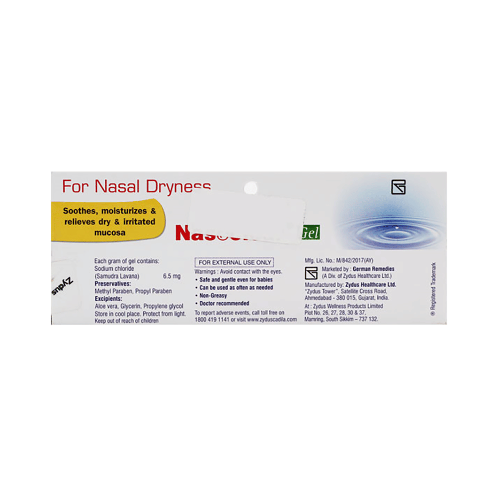 NASOclear Gel comprises of purified salt solution. It is used to treat nasal congestion (blocked nose). It moisturizes and loosens the mucus inside of the nose and provides rapid relief from nasal congestion. NASOclear Gel works by moisturizing the inner surface of the nose. It helps in providing relief from stuffy nose due to common cold or allergies. This medicine is for external use only. You should use it in a dose and duration as advised by your doctor.Before using this medicine, check the label. You have to tilt your head as far back as possible. Hold the dropper close to the nose. Make sure that you do not touch the nozzle. Squeeze the dropper gently so that the medicine gets placed in the nose. After few minutes, you can bend your head forward.It is generally safe with little or no side effects. However, it might cause nasal irritation at the time of application. Before using this medicine, inform your doctor if you are on any medication or are allergic to this medication. Also, inform your doctor if you are pregnant or breastfeeding. Please consult your doctor, if you miss any dose.