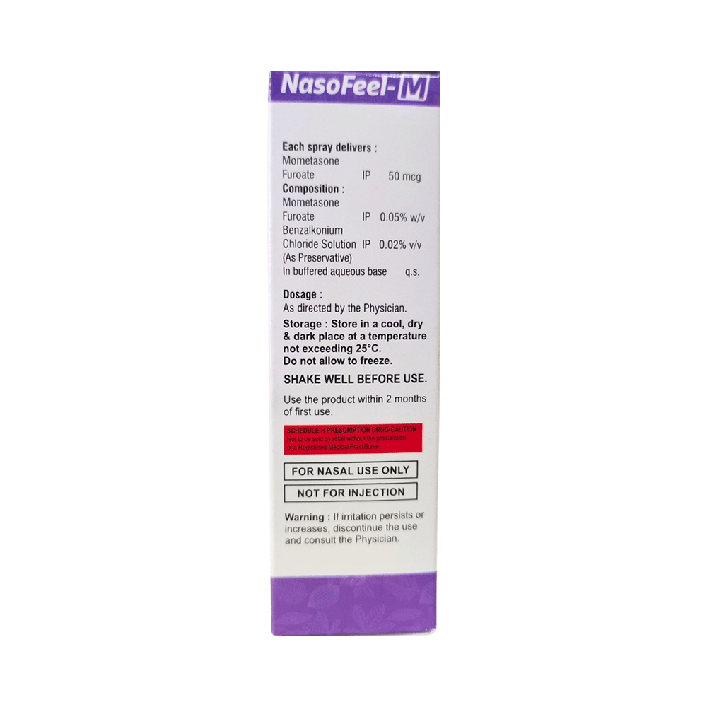 Nasofeel-M Nasal Spray is a medicine used to prevent and treat allergic symptoms like sneezing and runny nose due to allergies, nasal congestion, and nasal polyps. It works by reducing swelling and irritation in your nose and belongs to a group of medicines called corticosteroids. You should always use Nasofeel-M Nasal Spray as advised by your doctor. To get the full benefit of the medicine you should take it regularly. Blow your nose gently before using it, keep one nostril closed while applying the medicine into the other, and then sniff hard to make sure it reaches deep into the nose. Repeat for the other nostril.The most common side effects of this medicine include nasal irritation, sore throat, wheezing, nosebleed, upper respiratory tract infection, viral infections, and vomiting. If you are worried about any of the side effects, let your doctor know. Your doctor might be able to help you cope with the side effects. In general, you should try to avoid situations which make your symptoms worse (things like pollen and dust mites) and it’s best not to smoke.Before using this medicine, you should ask your doctor for advice if you are pregnant or breastfeeding. It is important to discuss the risks and benefits with your doctor. Let your doctor also know if you have any other medical conditions taking any other medicines.