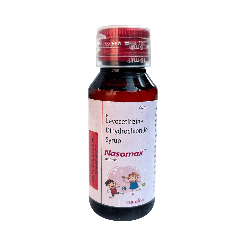 Nasomax Syrup belongs to a group of medicines called antihistamines. It is used to treat various allergic conditions such as hay fever, conjunctivitis, and some skin reactions such as eczema, hives, and reactions to bites and stings. It relieves watery eyes, runny nose, sneezing, and itching. Nasomax Syrup can be given with or without food. Your required dose may depend on the condition being treated. While this medicine is generally best given to your child in the evening, always follow your doctor’s instructions for proper use. Continue giving for as long as the doctor has prescribed. If it is stopped earlier than advised, your symptoms may come back.The most common side effects include feeling sleepy or dizzy, dry mouth, fatigue, fever, cough, vomiting, and diarrhea. These are usually mild and go away after a couple of days as your body adjusts to it. Consult your doctor if any of the side effects persist or worsen.Before taking it, tell your doctor if you have any kidney problems or epilepsy (seizures). Your dose may need to be modified, or this medicine may not suit you. Certain medications may interact with this one, so inform your doctor about any other medicines you are taking. If you are pregnant or breastfeeding, consult your doctor before use, even though it is not considered harmful.