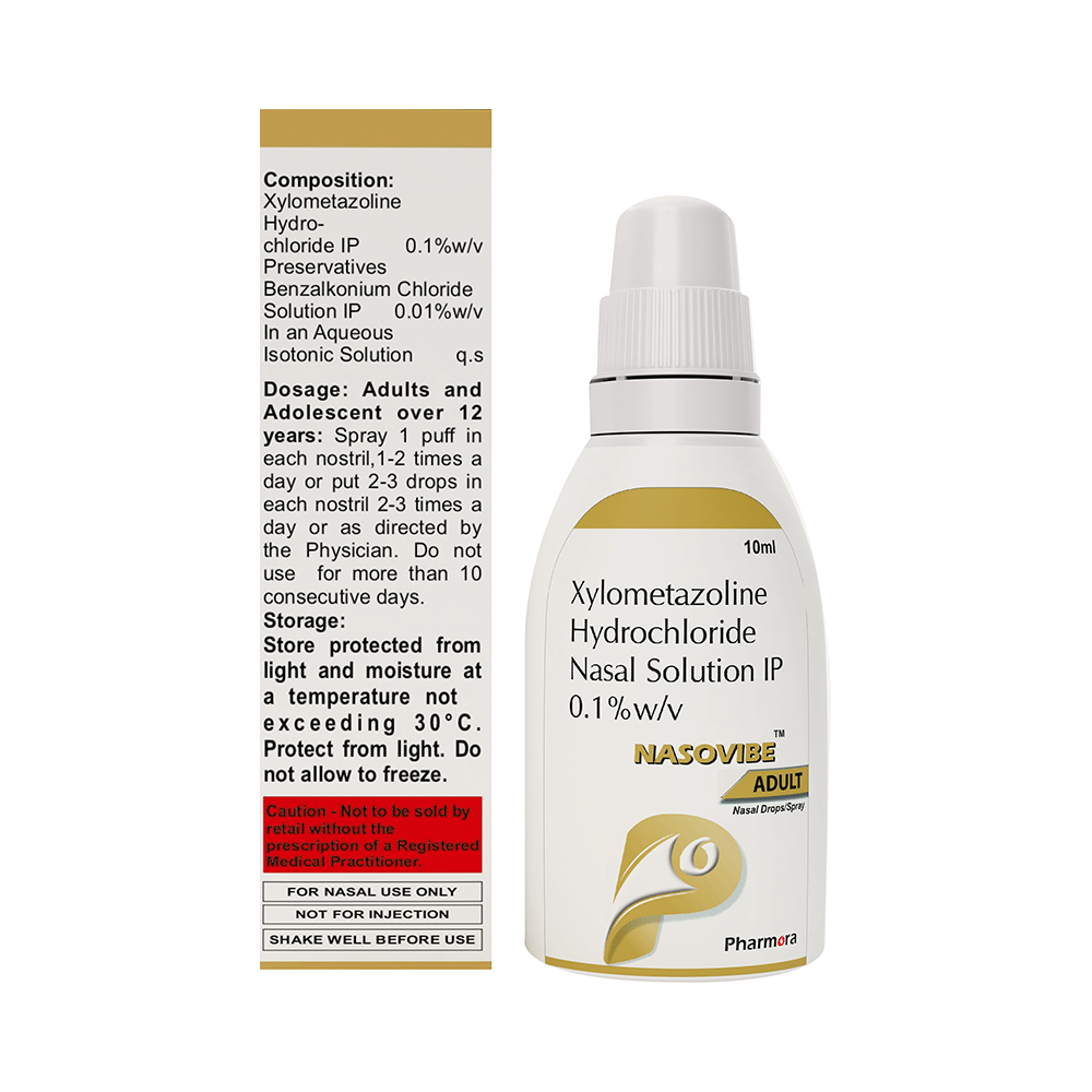 Nasovibe Adult Nasal Drop/Spray is a medicine used to treat nasal congestion (blocked nose) caused by the common cold or flu, hay fever, and other allergies. It shrinks blood vessels in your nose to relieve nasal congestion and blockage. Nasovibe Adult Nasal Drop/Spray should be used as you have been advised by your doctor. It provides only temporary relief so do not use it more often or for longer than recommended. Normally you should blow your nose gently before using it, keep one nostril closed while applying the medicine into the other, and then sniff hard to make sure it reaches deep into the nose. Then repeat for the other nostril. It provides relief very quickly and can last for several hours. If you use this medicine too often or for too long, it may worsen your symptoms rather than improve them.The most common side effects are burning sensation in the nose and throat, local irritation, nausea, headache, and dry nose. These are usually mild but if they bother you or do not go away, your doctor may be able to suggest ways of preventing or reducing them.It is generally a safe medicine but, before taking it, talk to your doctor about any health problems you have such as heart problems or high blood pressure (hypertension) or overactive thyroid gland or glaucoma, or prostate enlargement. Let your doctor know about any other medicines you are taking to make sure you are safe. Ask your doctor for advice before using this medicine if you are pregnant or breastfeeding.