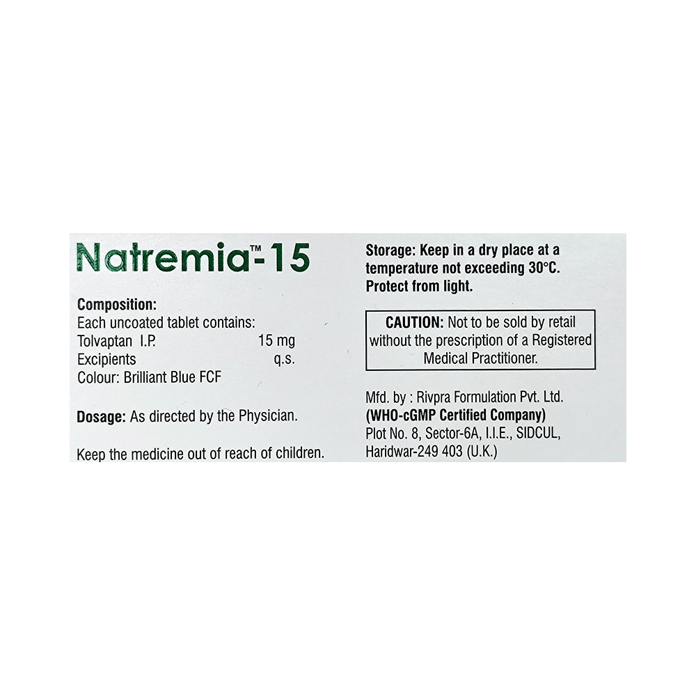 Natremia 15mg Tablet is a medicine used in the treatment of low levels of sodium in the blood. It treats low levels of sodium in the blood, which can result from conditions such as heart failure, cirrhosis, and syndrome of inappropriate antidiuretic hormone (SIADH). Natremia 15mg Tablet can be taken with or without food. It should be taken exactly as prescribed by your doctor. Your doctor will decide the dose and how often you should take them. You should take this medicine regularly to get the most benefit from it. Do not stop taking the medicine even if you feel better unless the doctor tells you so.Using this medicine may cause few common side effects such as frequent urge to urinate, nocturia (increased urge to urinate during the night), dryness in mouth, increased thirst, nausea, increased blood creatinine, hyperkalemia, and constipation. Let your doctor know if any of these side effects do not go away with time or get worse. Before using this medicine, inform your doctor if you have any problems with your kidneys or liver. While on this medicine, your doctor will closely monitor the sodium levels in your blood. You should also tell your doctor all the other medications you are taking.