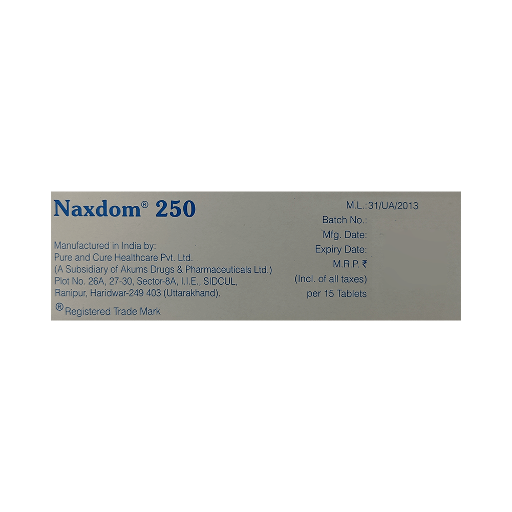 Take this medicine in the dose and duration as advised by your doctor. Swallow it as a whole. Do not chew, crush or break it. Naxdom 250 Tablet may be taken with or without food, but it is better to take it at a fixed time.