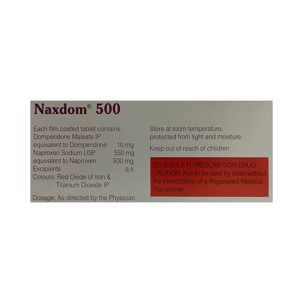 Naxdom 500 Tablet is a medicine used in the prevention of migraines. It inhibits the release of certain chemical messengers that cause pain, inflammation, and fever. It also blocks the signals in the brain that cause nausea and vomiting associated with migraines. Naxdom 500 Tablet may be prescribed alone or in combination with another medicine. It can be taken with or without food. The dose and duration will depend on the severity of your condition and how well it helps your symptoms. Use it regularly and do not discontinue it until the doctor tells you it is right to stop.Using Naxdom 500 Tablet may cause common side effects such as headaches, ringing in the ears, dizziness, tiredness, rashes, and vision changes. If you experience such side effects that do not go away or get worse, you should let your doctor know. Your doctor may be able to suggest ways of preventing or reducing the symptoms.In general, you should try to use the smallest amount necessary to control your symptoms. Before using the medicine, you should tell your doctor if you have any other illnesses or disorders. It may also affect, or be affected by, some other medicines you are using, so let your doctor know all the other medicines you are taking. Pregnant and breastfeeding women should consult their doctors first before using the medicine.