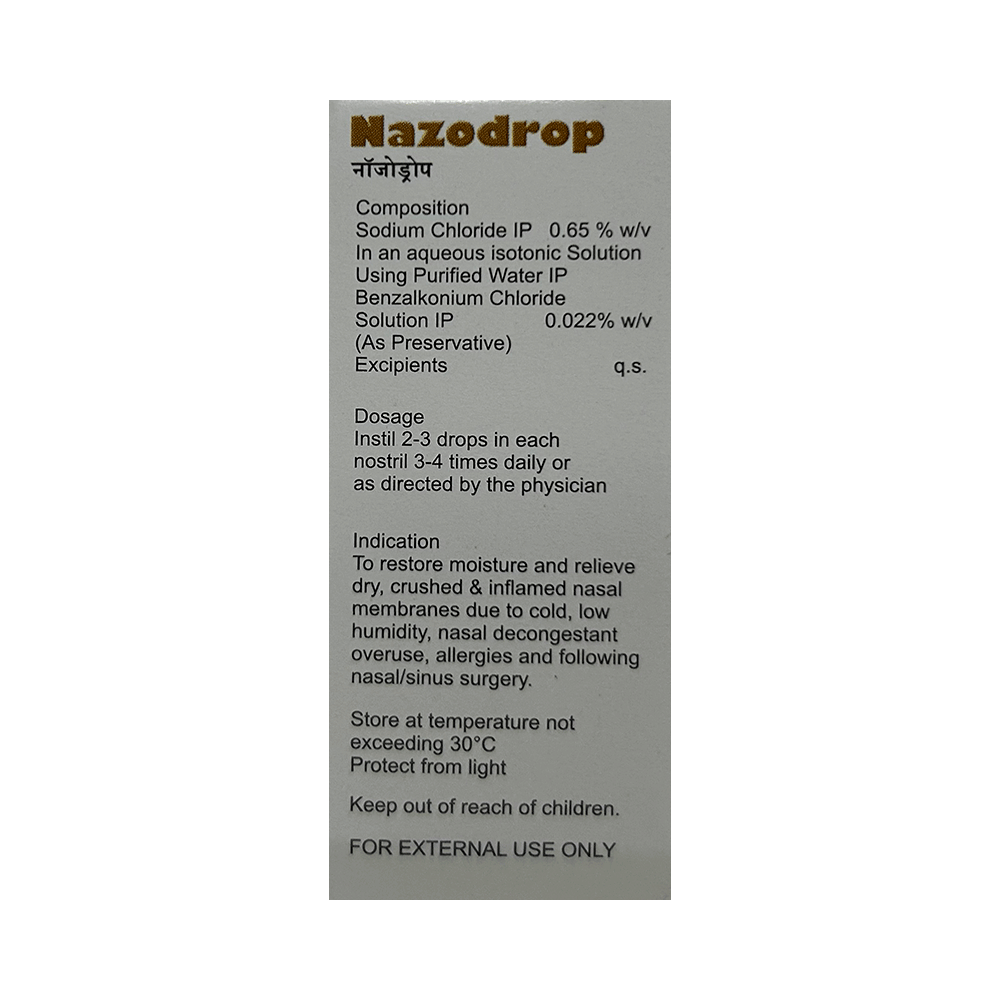 Nazodrop 0.65% Nasal Drops is a purified salt solution. It moisturizes the inner surface of the nose and helps relieve stuffy nose due to common cold or allergies.