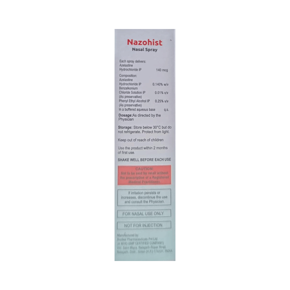 Nazohist Nasal Spray is an antihistaminic medication. It treats allergy symptoms such as runny nose, sneezing, and itchy nose by blocking the effects of a chemical messenger (histamine) in the body.