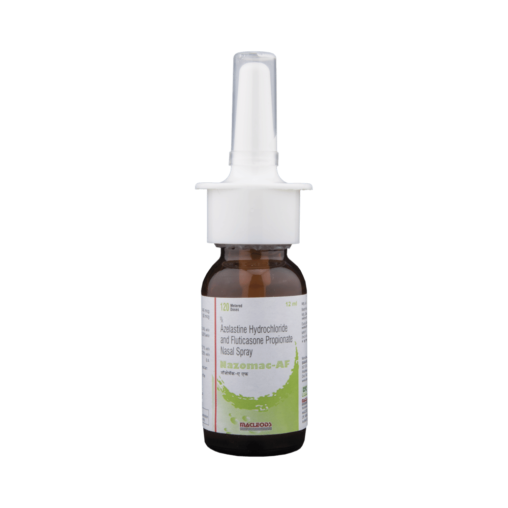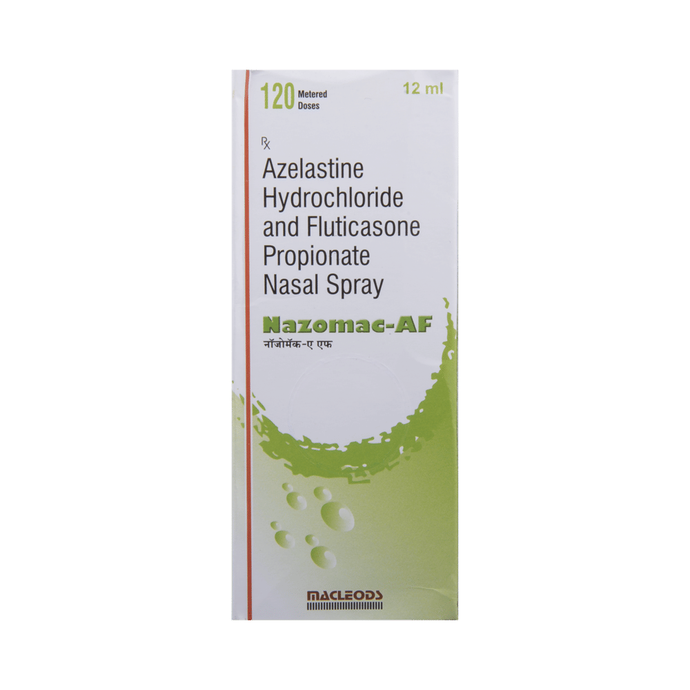 Nazomac-AF Nasal Spray is a combination of two medicines: Fluticasone Propionate and Azelastine, which relieves sneezing and runny nose caused due to allergies (allergic rhinitis). Fluticasone Propionate is a steroid which works by blocking the release of certain chemical messengers that cause inflammation (swelling) and irritation in the nose. Azelastine is an antiallergic which relieves allergy symptoms like runny nose, watery eyes and sneezing.