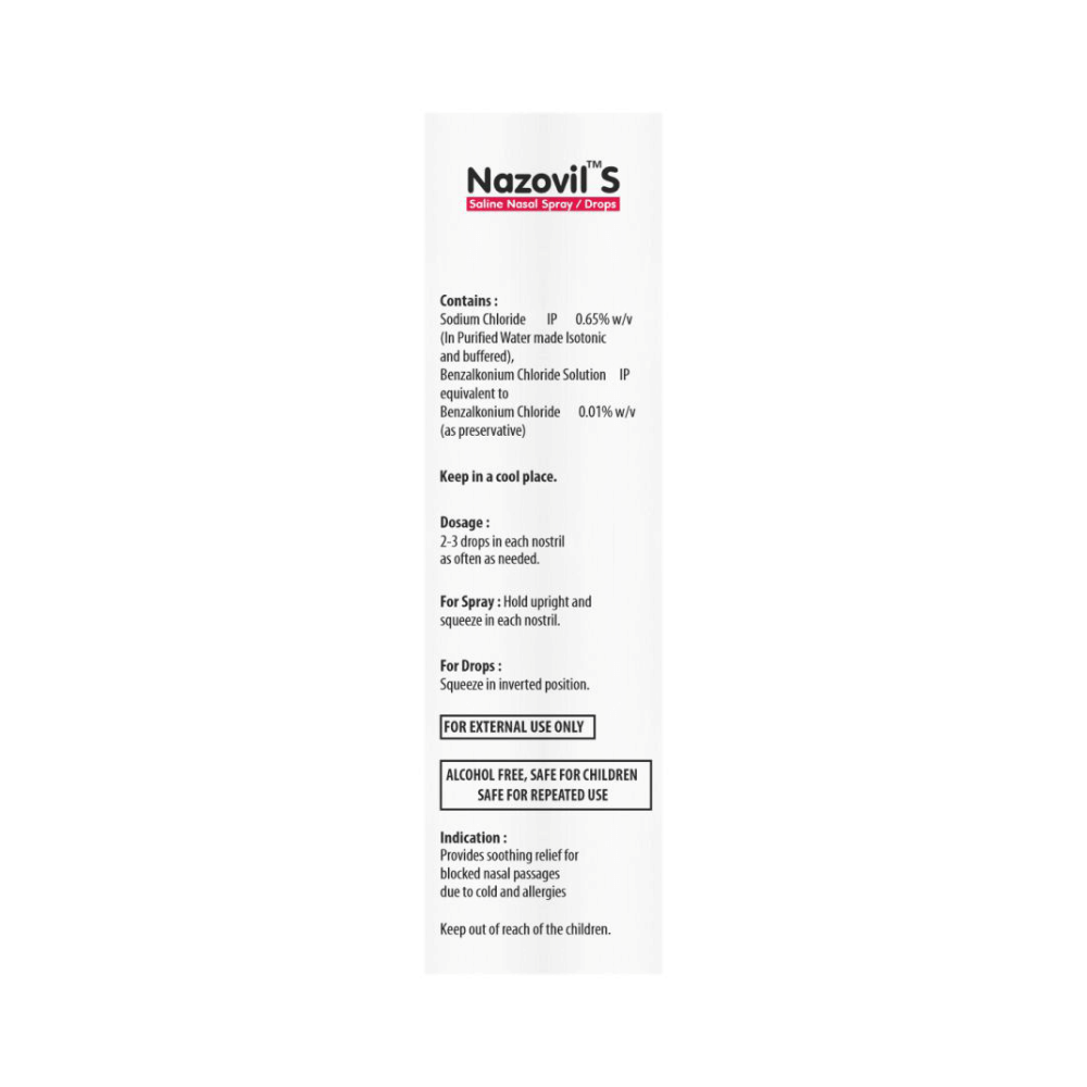 Nazovil S Saline Nasal Spray/Drops is a purified salt solution. It moisturizes the inner surface of the nose and helps relieve stuffy nose due to common cold or allergies.