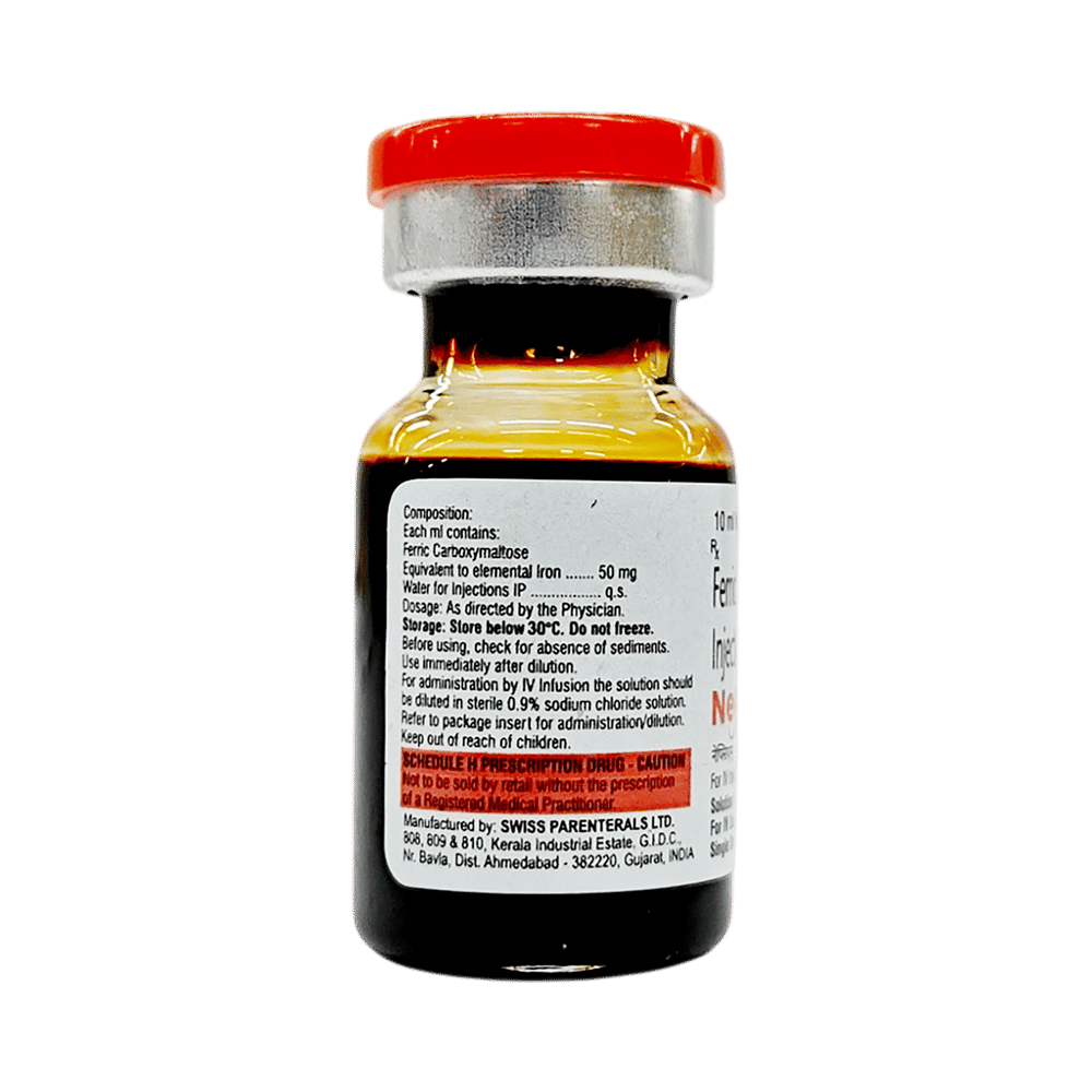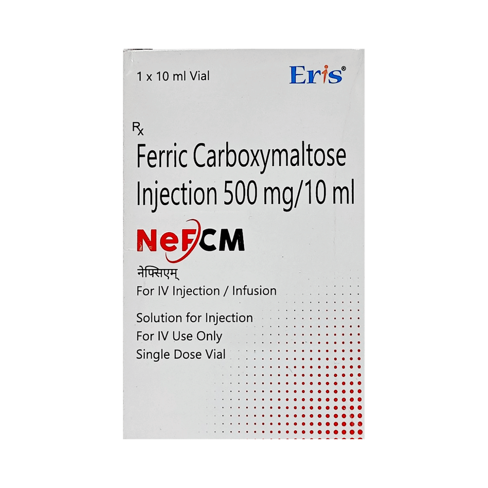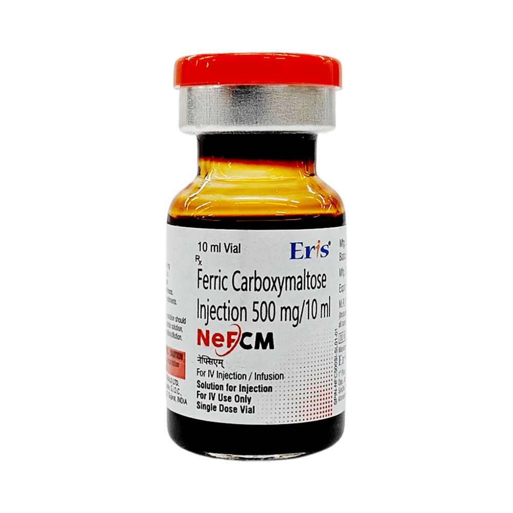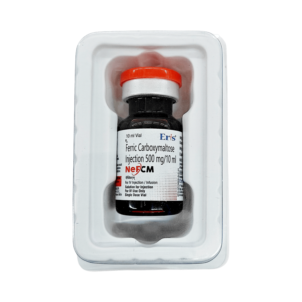 Nefcm 500mg Injection is an iron replacement medicine. It is used to treat a type of anemia where you have fewer amount of red blood cells due to insufficient iron in your body (iron-deficiency anemia). Iron is needed to produce the red blood cells that carry oxygen around your body. Nefcm 500mg Injection is given by injection or infusion (saline drip) into a vein by your doctor or nurse. You will be watched carefully to make sure you do not have an allergic reaction. It is usually given in two doses, seven days apart. Your doctor will decide how much and how often you may need injections to improve your anemia. Eating a well-balanced diet that has enough iron, vitamins, and minerals can help to replenish your iron reserves. Good sources of iron include meat, eggs, raisins, broccoli, and lentils. The most common side effects include vomiting, headache, dizziness, high blood pressure, and pain or irritation at the site of injection. Most of these usually go away within a short time of the injection. If you are bothered by them or they go on for longer, talk to your doctor or nurse. You should not have this medicine if your anemia is not caused by a lack of iron. Before taking it, tell your doctor if you have rheumatoid arthritis, asthma or other allergies, high blood pressure, or liver problems. This may affect your treatment. It is not known whether this medicine is safe for use if you are pregnant or breastfeeding so please take advice from your doctor. You will have tests to check your blood cells and iron levels, monitor your progress, and check for side effects. It may be advisable to limit alcohol during treatment.
