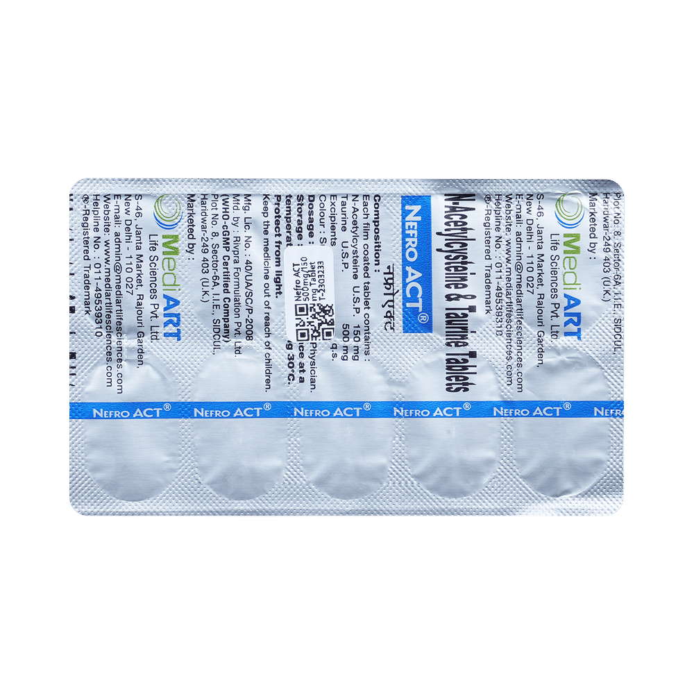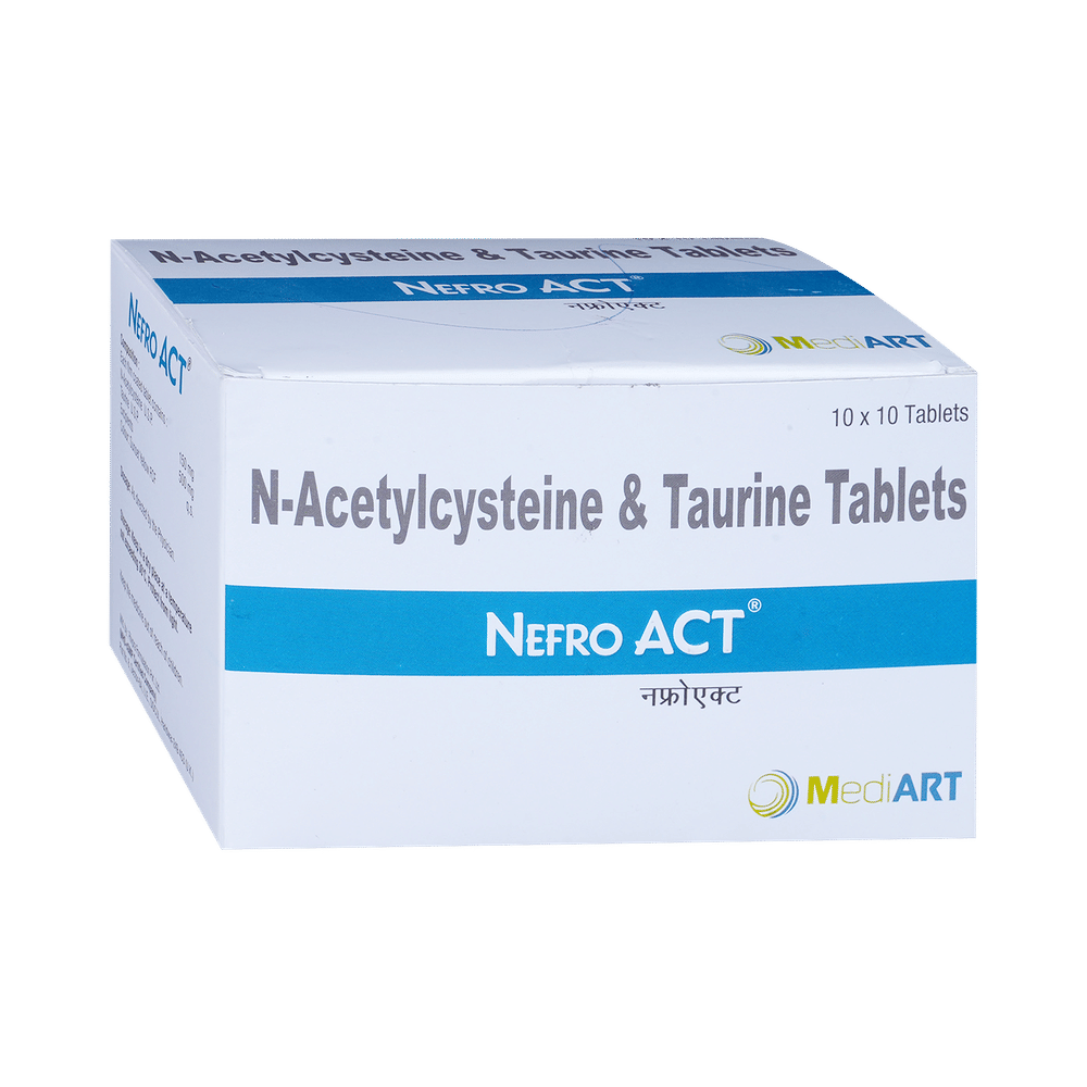Nefro ACT 500mg/150mg Tablet is a combination of two antioxidants: Taurine and Acetylcysteine. These antioxidants work by protecting the kidneys from damage by harmful chemical (free radicals).
