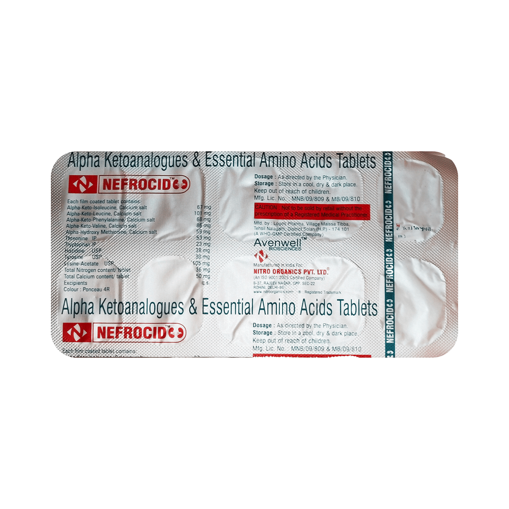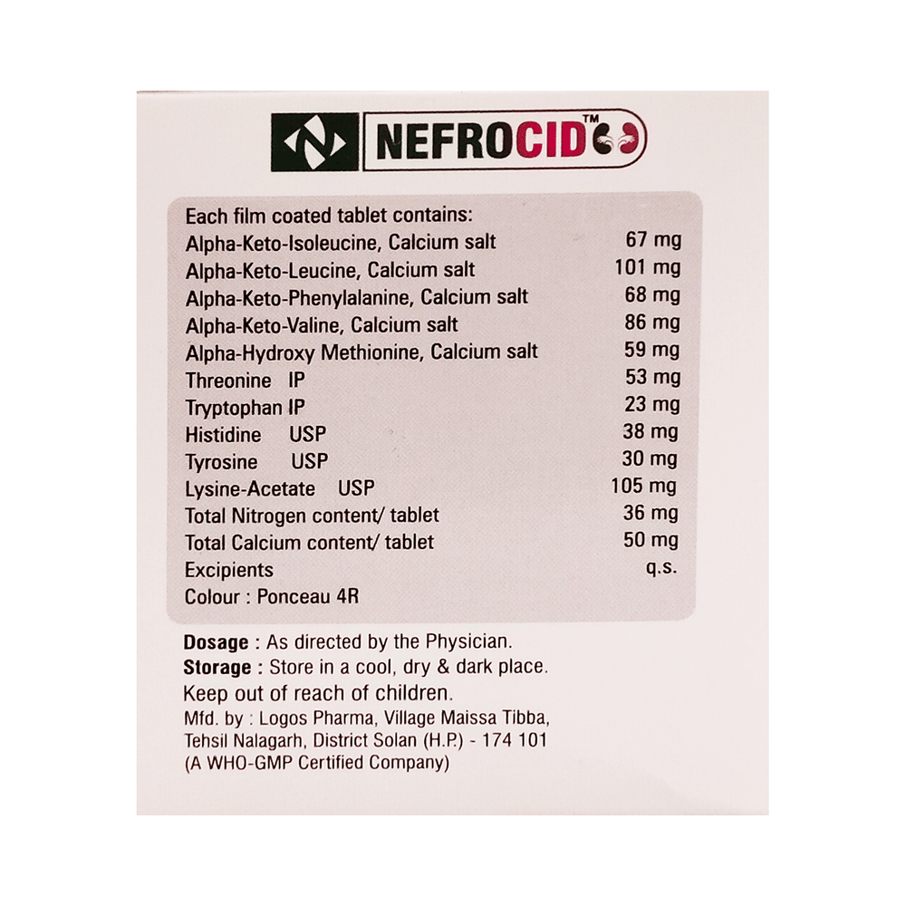Nefrocid Tablet is a nutritional supplement used in the treatment of chronic kidney disease. It reduces urea levels in the blood and helps prevent the progression of kidney disease. This way it delays the risk of undergoing long-term dialysis. Nefrocid Tablet is to be taken by mouth with or without food. Take it in the exact dose and duration as advised by the doctor. Taking it along with a low-protein diet may help get the best of the medicine. Ensure that you maintain adequate calorie intake during treatment. While you are taking this medicine, your doctor may advise regular monitoring of serum calcium levels.There is limited data on the side effects of Nefrocid Tablet. Let your doctor know if you experience any symptoms while taking Nefrocid Tablet. They may be able to suggest ways to treat or manage the side effects.Before taking Nefrocid Tablet, it is important to tell your doctor if you are taking any other medicines for other health conditions. Avoid taking Nefrocid Tablet if you are allergic to its ingredients, or have high calcium levels (hypercalcemia). Regular monitoring of calcium levels is recommended during use.Avoid combining Nefrocid Tablet with calcium-containing supplements or certain antibiotics (e.g., tetracyclines, quinolones) without consulting a doctor, as they may interfere with absorption. Pregnant, breastfeeding women, and individuals with liver disease should seek a doctor’s advice before use. Avoid activities requiring full mental alertness, such as driving, until you know how the medication affects you.