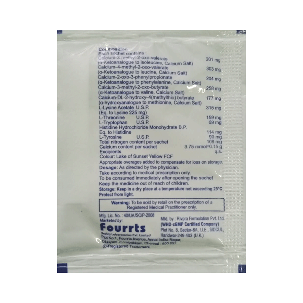 Nefrosave Keto Sachet is a nutritional supplement used in the treatment of chronic kidney disease. It reduces urea levels in the blood and helps prevent the progression of kidney disease. This way it delays the risk of undergoing long-term dialysis. Nefrosave Keto Sachet is to be taken by mouth with or without food. Take it in the exact dose and duration as advised by the doctor. Taking it along with a low-protein diet may help get the best of the medicine. Ensure that you maintain adequate calorie intake during treatment. While you are taking this medicine, your doctor may advise regular monitoring of serum calcium levels.There is limited data on the side effects of Nefrosave Keto Sachet. Let your doctor know if you experience any symptoms while taking Nefrosave Keto Sachet. They may be able to suggest ways to treat or manage the side effects.Before taking Nefrosave Keto Sachet, it is important to tell your doctor if you are taking any other medicines for other health conditions. Avoid taking Nefrosave Keto Sachet if you are allergic to its ingredients, or have high calcium levels (hypercalcemia). Regular monitoring of calcium levels is recommended during use.Avoid combining Nefrosave Keto Sachet with calcium-containing supplements or certain antibiotics (e.g., tetracyclines, quinolones) without consulting a doctor, as they may interfere with absorption. Pregnant, breastfeeding women, and individuals with liver disease should seek a doctor’s advice before use. Avoid activities requiring full mental alertness, such as driving, until you know how the medication affects you.