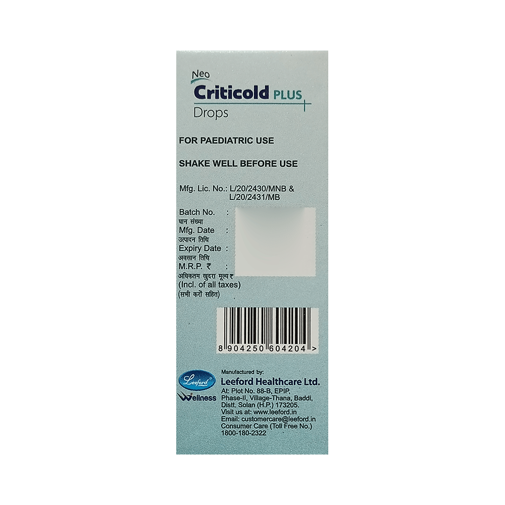 Neo Criticold Plus Oral Drops is a medicine used in the treatment of common cold symptoms. It provides relief from symptoms such as headache, sore throat, runny nose, muscular pain, and fever. Neo Criticold Plus Oral Drops can be taken with or without food. The dose and duration will depend on the severity of your condition. You should keep taking the medicine even if you feel better until the doctor says it is alright to stop using it.Using this medicine may cause a few common side effects such as nausea, vomiting, sleepiness, dizziness, and headache. If any of these side effects do not resolve with time or get worse, you should let your doctor know. Your doctor may be able to suggest ways of preventing or reducing the side effects. In general, you should try to use the smallest amount necessary to control your symptoms.Before using the medicine, you should tell your doctor if you have any other medical conditions or disorders. To make sure it is safe, you should let your doctor know all the other medicines you are taking. Also, tell your doctor if you have any problems with the liver or kidneys. Avoid consumption of alcohol while on treatment with this medicine as it may increase the chance of some side effects. Pregnant and breastfeeding women should consult their doctors first before using the medicine.