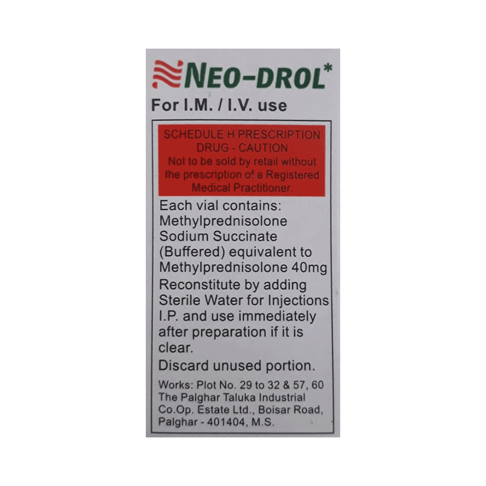 In Treatment of Allergic conditionsNeo-Drol 40mg Injection is used to treat different inflammatory and allergic conditions including arthritis, lupus, psoriasis, ulcerative colitis which affect the skin, blood, eyes, lungs, stomach, and nervous system. It works by lowering your immune system’s response to these conditions thereby reducing symptoms such as swelling, pain, itching and other allergic-type reactions.This medicine is given orally (by mouth). You should always take it as it has been prescribed for you. Do not stop taking it without your doctor’s advice. This can cause unpleasant withdrawal symptoms. Because this medicine weakens your immune system, you should avoid being near people who are ill or have infections.In Treatment of Systemic lupus erythematosus (SLE)Systemic lupus erythematosus (SLE) is an autoimmune disease. In this disease, the immune system of the body mistakenly attacks healthy tissue. It can affect the skin, joints, kidneys, brain, and other organs. Neo-Drol 40mg Injection prevents the release of substances in the body that cause inflammation. It lowers your immune system’s response and reduces symptoms such as swelling, pain, itching and other allergic-type reactions.In Treatment of Skin disordersNeo-Drol 40mg Injection prevents the release of substances in the body that cause inflammation. It can be used to treat different inflammatory and allergic conditions of the skin such as eczema and psoriasis. It works by lowering your immune system’s response to these conditions thereby relieving symptoms such as swelling, pain, itching and other allergic-type reactions.In Treatment of Eye disordersNeo-Drol 40mg Injection helps relieve symptoms of eye infections such as redness, swelling, itching and watering of eyes. This medicine works by decreasing the production of certain chemicals that cause inflammation of the eyes. This will make it easier for you to go about your daily activities. Use it as prescribed to get the most benefit. If you see no improvement even after a week, talk to your doctor.In Treatment of Rheumatic disorderRheumatic disorder is an autoimmune condition where your body’s immune system (which usually fights bacteria and viruses) attacks your body’s own cells. Neo-Drol 40mg Injection stops that from happening and can relieve the symptoms of this condition such as pain, swelling, and stiffness in your joints. It can also slow down joint damage, reduce disability, and enable you to be as active for as long as possible. It can take several weeks or months to notice the effect of the medicine. You should continue taking it until your doctor says it is okay to stop using the medicine.show moreshow less