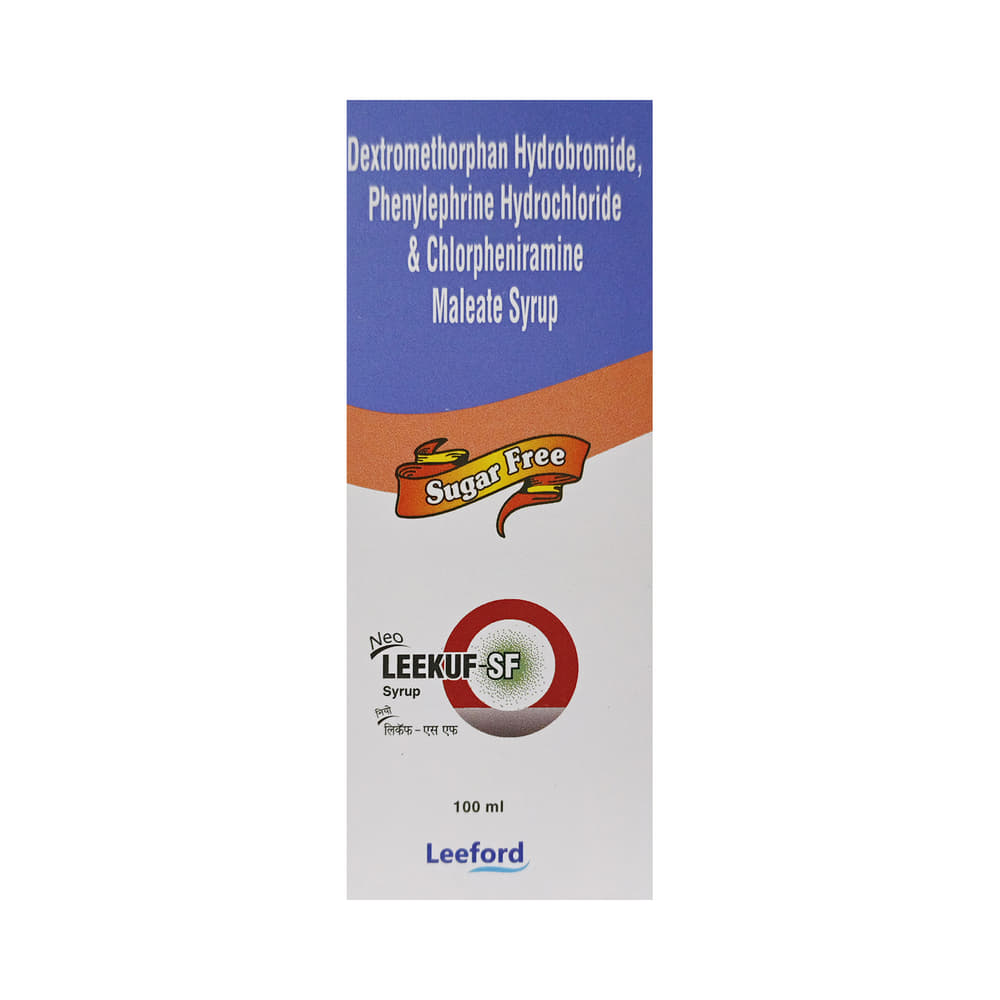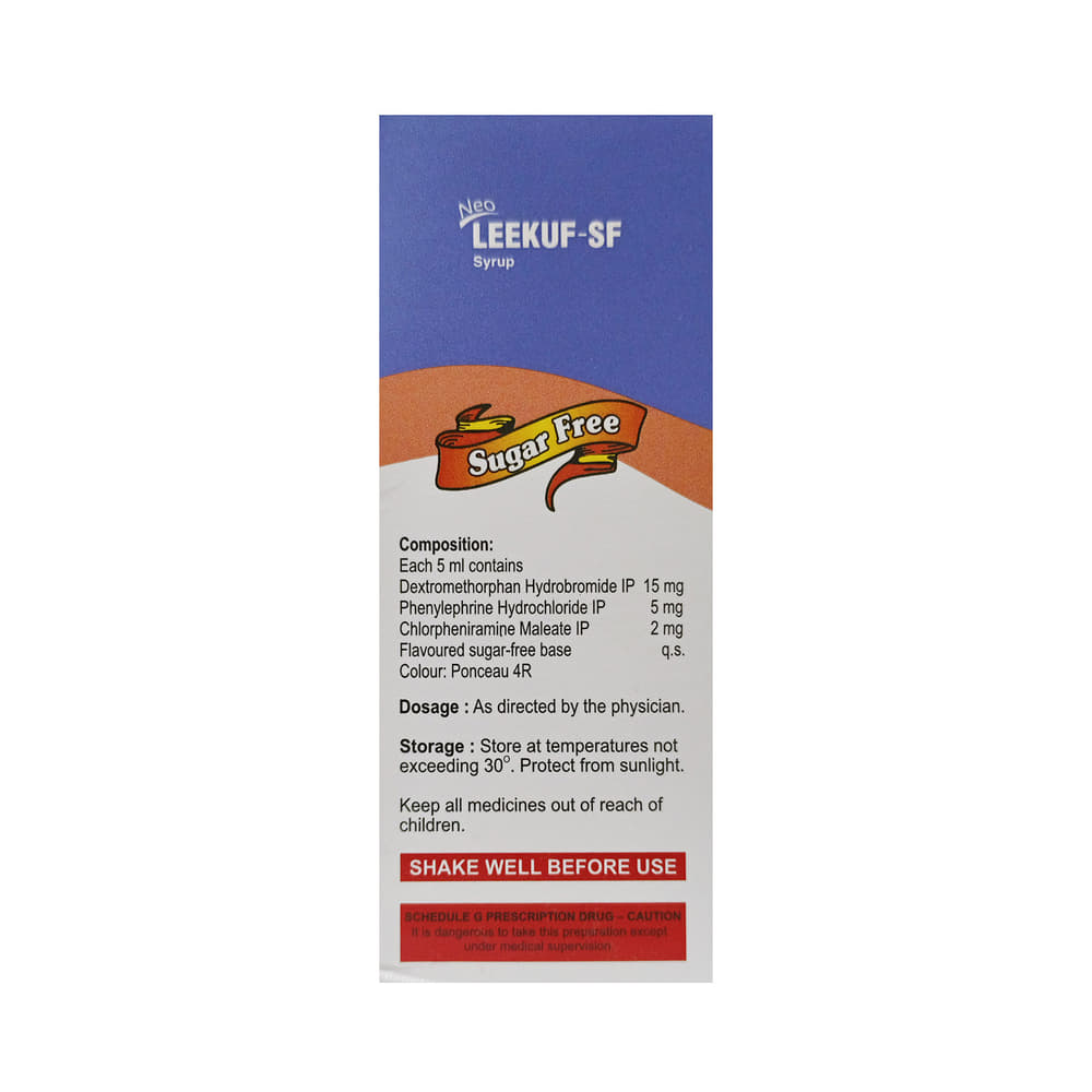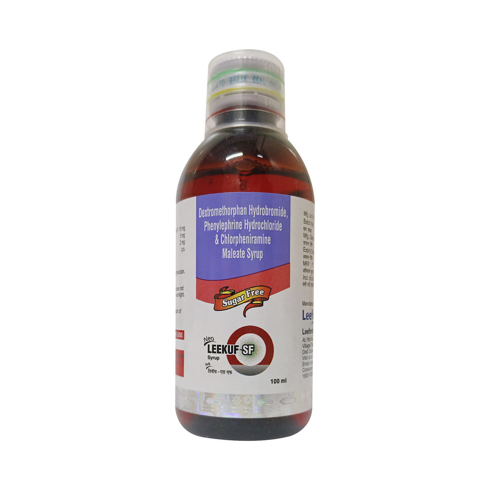 Neo Leekuf SF Syrup Sugar Free is a medicine used in the treatment of common cold and cough. It can provide quick relief from cough and common cold symptoms like runny nose, stuffy nose, sneezing, watery eyes, and congestion or stuffiness. Neo Leekuf SF Syrup Sugar Free is taken with or without food in a dose and duration as advised by the doctor. The dose you are given will depend on your condition and how you respond to the medicine. You should keep taking this medicine for as long as your doctor recommends. If you stop treatment too early your symptoms may come back and your condition may worsen. Let your healthcare team know about all other medications you are taking as some may affect, or be affected by this medicine.Common side effects of this medicine include headache, sedation, double vision, vomiting, diarrhea, dry mouth, and nausea. Most of these are temporary and usually resolve with time. Contact your doctor straight away if you are at all concerned about any of these side effects. This medicine can also cause sleepiness, so do not drive or do anything that requires mental focus until you know how this medicine affects you. Avoid drinking alcohol while taking this medicine as it can worsen your sleepiness.Never support self-medication or recommend your medicine to another person. It is beneficial to have plenty of fluids while taking this medication. Before taking this medicine, you should tell your doctor if you are pregnant, planning pregnancy or breastfeeding. You should also tell your doctor if you have any kidney or liver diseases so that your doctor can prescribe a suitable dose for you.