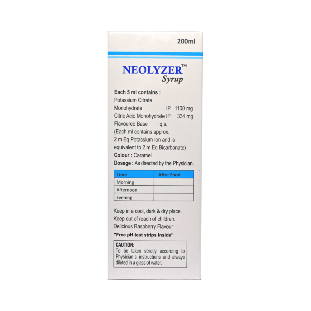 Neolyzer Syrup Sugar Free is a combination of two medicines: Citric Acid and Potassium Citrate, which prevents kidney stones. It raises urine pH and prevents the formation, growth and aggregation of crystals in the kidneys, thereby preventing stones.