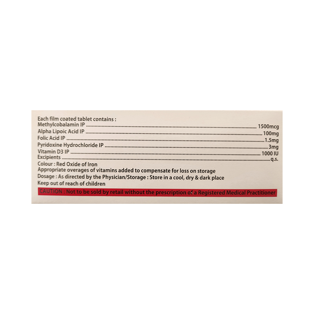 Salt Composition: Methylcobalamin (1500mcg) + Alpha Lipoic Acid (100mg) + Vitamin B6 (Pyridoxine) (3mg) + Folic Acid (1.5mg) + Vitamin D3 (1000IU)