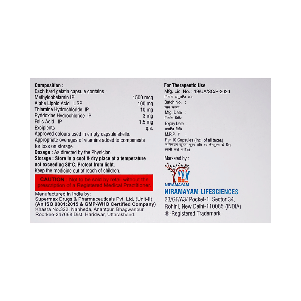 Salt Composition: Methylcobalamin (1500mcg) + Alpha Lipoic Acid (100mg) + Thiamine mononitrate (10mg) + Pyridoxine Hydrochloride (3mg) + Folic Acid (1.5mg)
