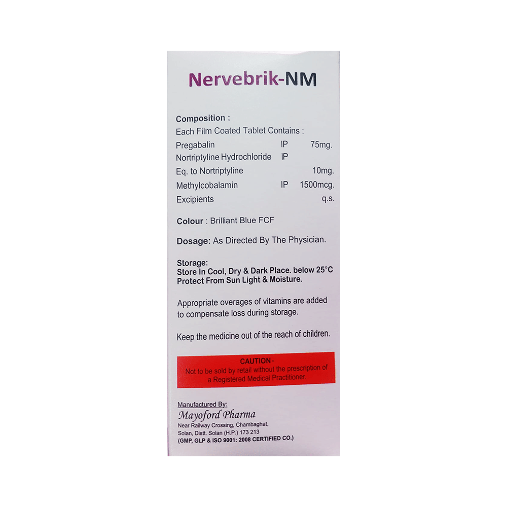 Nervebrik-NM Tablet is a combination of three medicines used to treat neuropathic pain. It works by decreasing pain by controlling calcium channel activity of the nerve cells. It also increases the level of chemical messengers in the brain that help in regulating the mood and protect nerve fibers. Nervebrik-NM Tablet can be taken with or without food. However, it is advised to take it at the same time each day as this helps to maintain a consistent level of medicine in the body. Take this medicine in the dose and duration advised by the doctor. If you miss a dose of this medicine, take it as soon as you remember. Finish the full course of the treatment even if you feel better. It is important not to stop taking this medicine suddenly as it may worsen your symptoms.Some common side effects of this medicine include constipation, weight gain, and dryness in mouth. It may cause dizziness and sleepiness, so do not drive or do anything that requires mental focus until you know how this medicine affects you. This medicine may cause weight gain and to control it, you should have a balanced diet and exercise regularly. You must inform your doctor if you develop any unusual changes in mood or behavior, new or worsening depression, or suicidal thoughts.Before taking this medicine let your doctor know if you suffer from kidney or liver disease. Your doctor should also know about all other medicines you are taking as many of these may make this medicine less effective or change the way it works. Inform your doctor if you are pregnant, planning pregnancy or breastfeeding.