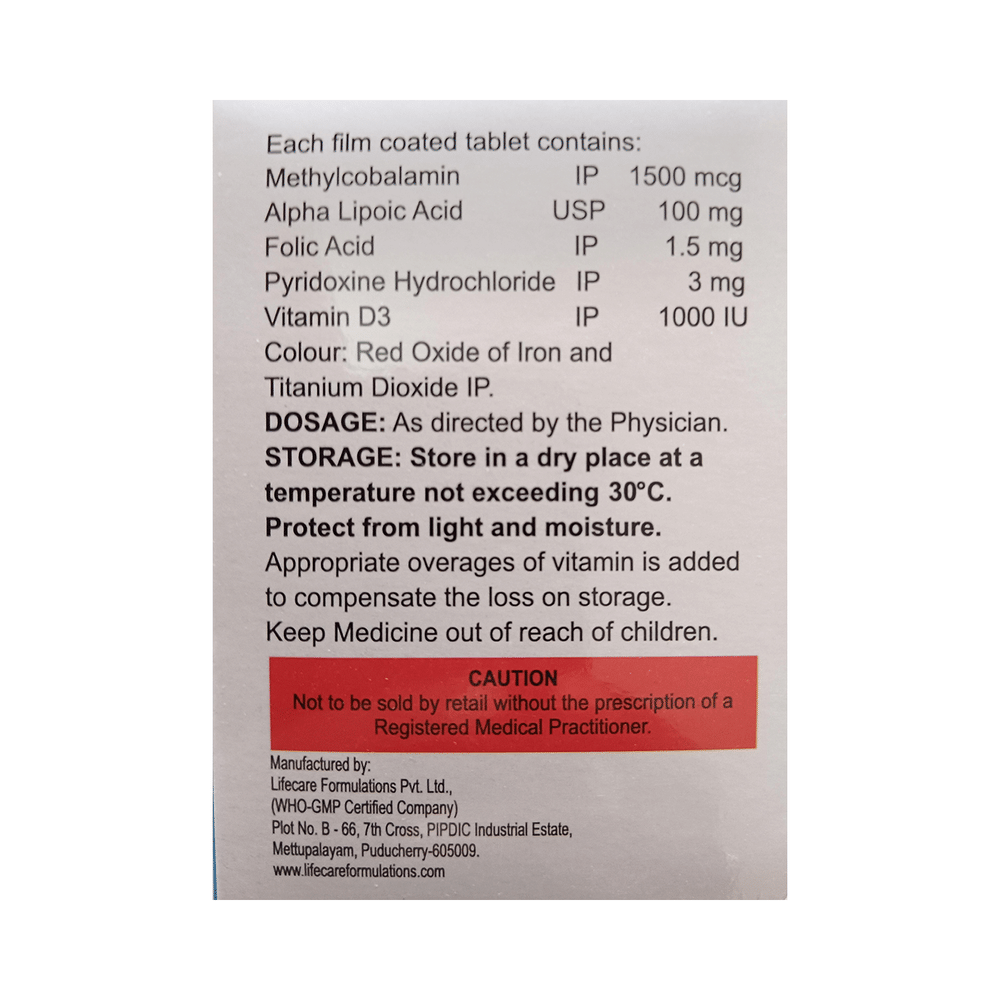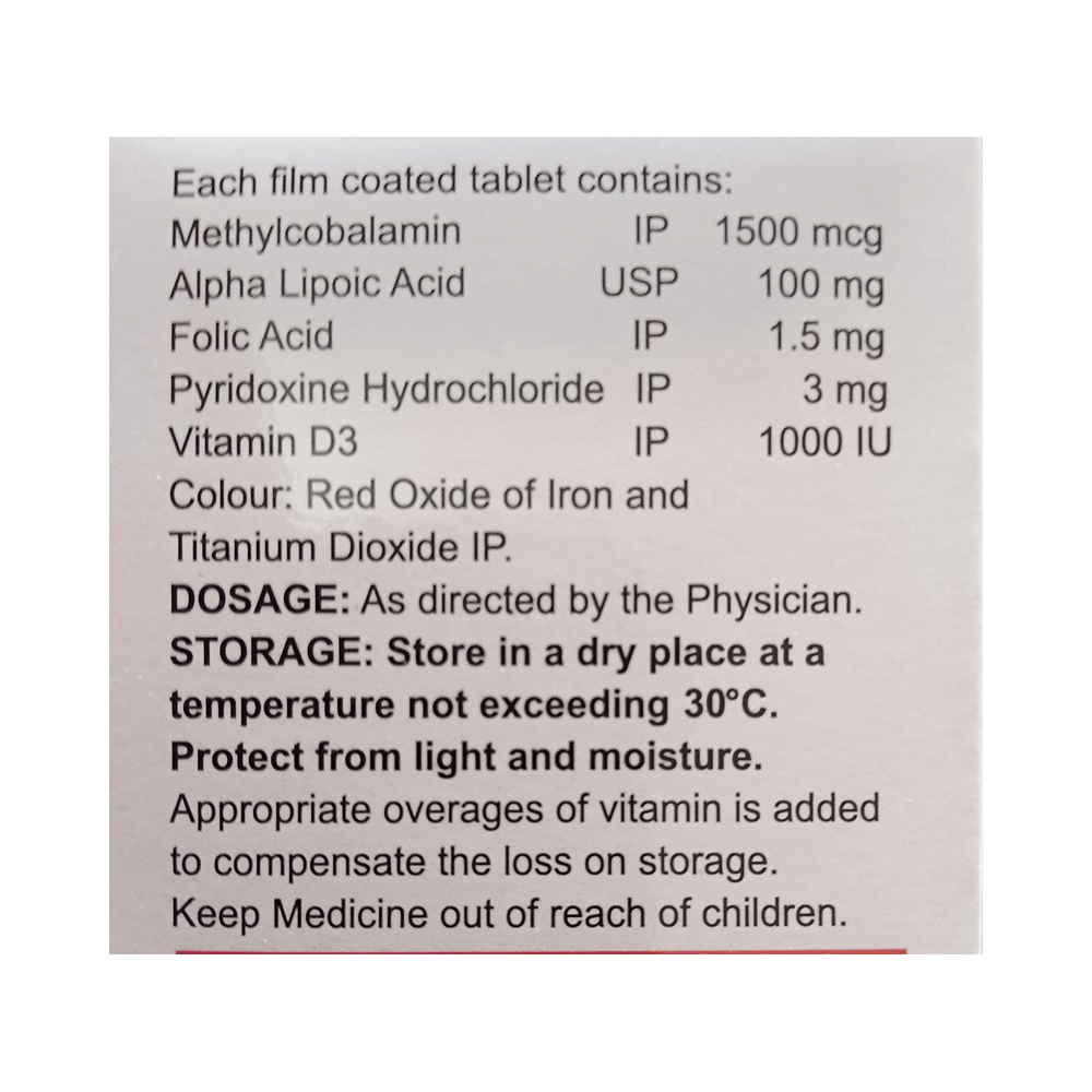 Salt Composition: Methylcobalamin (1500mcg) + Alpha Lipoic Acid (100mg) + Vitamin B6 (Pyridoxine) (3mg) + Folic Acid (1.5mg) + Vitamin D3 (1000IU)