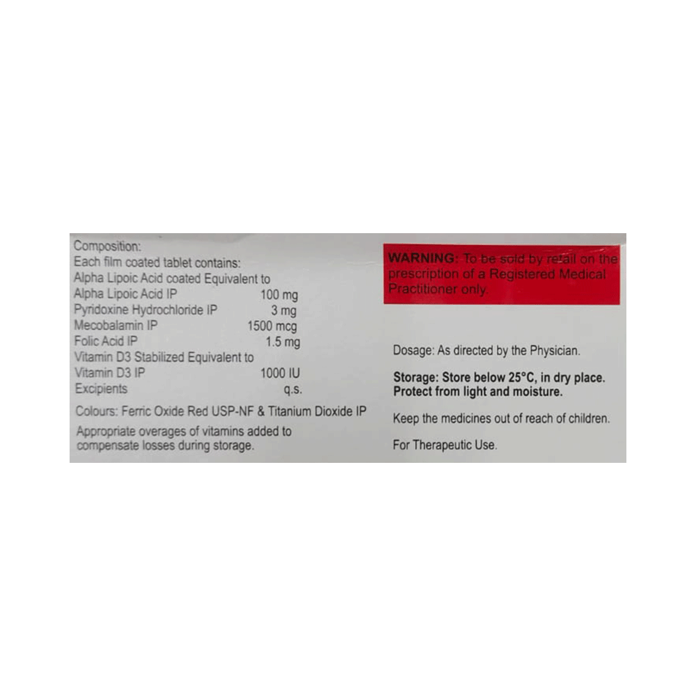 Salt Composition: Methylcobalamin (1500mcg) + Alpha Lipoic Acid (100mg) + Vitamin B6 (Pyridoxine) (3mg) + Folic Acid (1.5mg) + Vitamin D3 (1000IU)