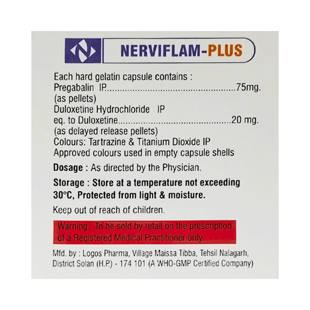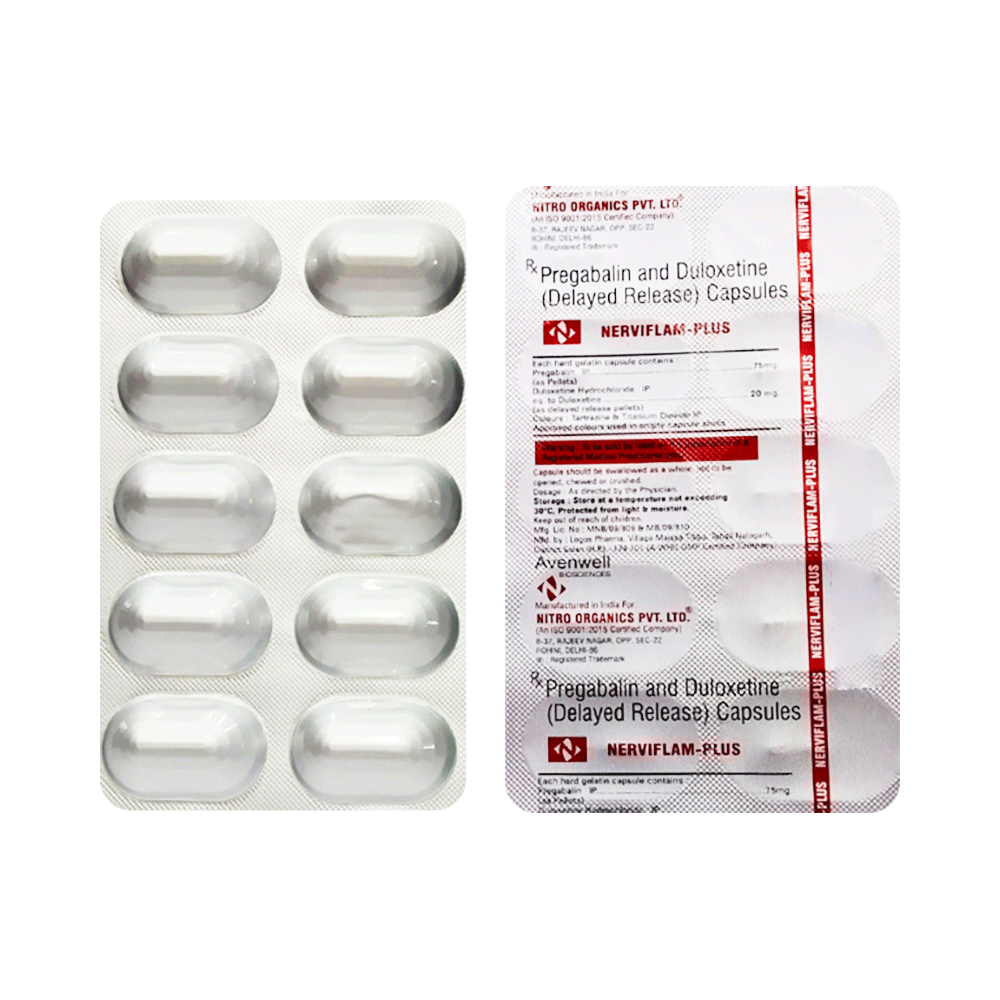 Nerviflam-Plus Capsule DR is a combination of two medicines: pregabalin and duloxetine. Pregabalin decreases neurotransmitter release, while duloxetine boosts serotonin and norepinephrine levels to modulate pain perception, working together to relieve nerve pain.