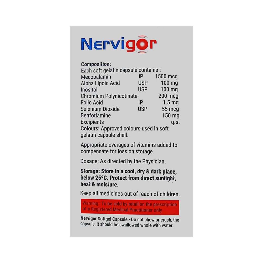 Nervigor Soft Gelatin Capsule is a combination of Methylcobalamin, Alpha Lipoic Acid, Myo-Inositol, Folic Acid, Chromium Picolinate, Selenium, and Benfotiamine. Methylcobalamin is a form of vitamin B12 that restores its level in the body thereby helping in treating certain anemias and nerve problems. Alpha lipoic acid acts as a potent antioxidant (substance that protects against cell damage) by neutralizing the free radicals (waste products formed in the body during energy production) such as reactive oxygen and nitrogen species. Further, it initiates natural antioxidant processes in the body. It also maintains the levels of Vitamin E and Vitamin C in the body. Myo-inositol works by relaxing the blood vessels and improving blood flow to the legs, toes and fingers, thereby relieving pain. Folic Acid is a form of vitamin B. It plays a vital role in the formation of red blood cells, which carry oxygen throughout the body. It is also essential in pregnancy due to its role in the development of the unborn baby's brain and spinal cord. Chromium Picolinate, Selenium, and Benfotiamine are nutritional supplements that provide essential nutrients to our body and improve overall health.