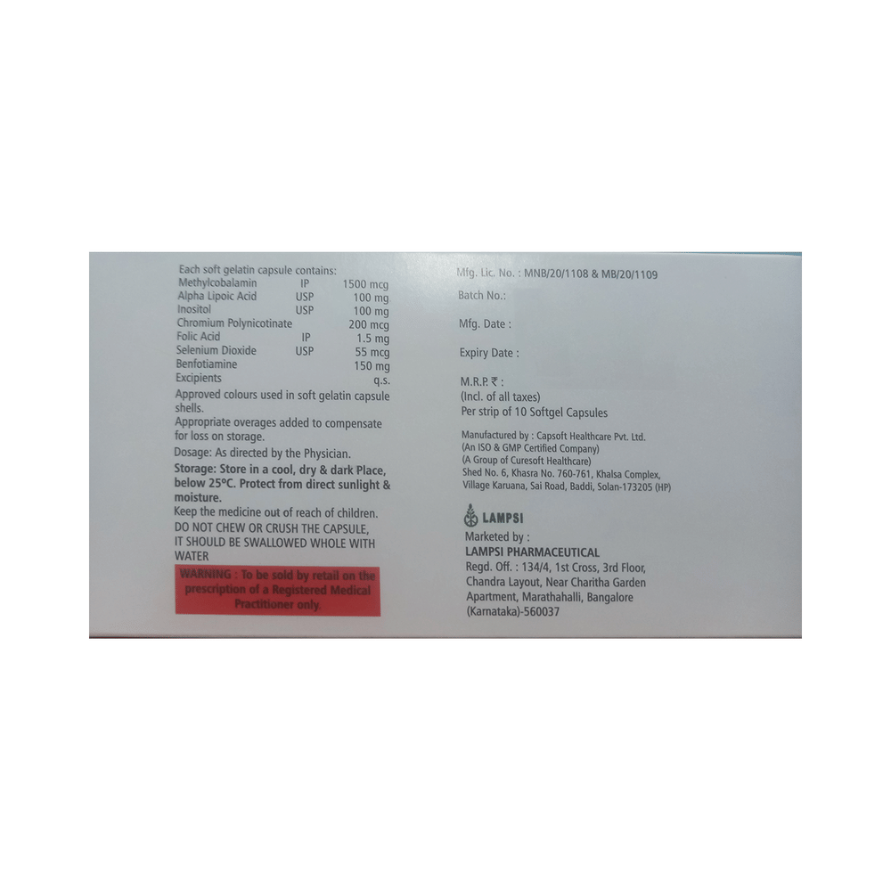 Salt Composition: Methylcobalamin (1500mcg) + Alpha Lipoic Acid (100mg) + Myo-Inositol (100mg) + Folic Acid (1.5mg) + Chromium Picolinate (200mcg) + Selenium (55mcg) + Benfotiamine (150mg)