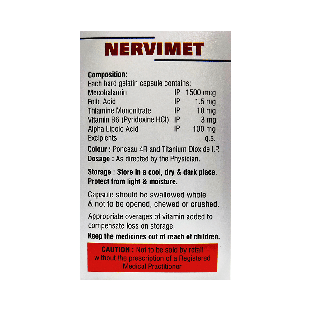 Nervimet Capsule is a combination of multiple nutritional supplements. It is taken to treat nutritional deficiencies such as vitamins and other minerals in the body. It fulfills the deficiency to prevent related disorders. It also ensures proper growth and functioning of the body. Nervimet Capsule may be taken with or without food. Take it in the dose and duration advised by the doctor. Take it regularly at the same time each day to get maximum benefits from it. Do not take it more than or longer than prescribed by the doctor, as that may cause harmful effects.It is generally safe medicine with little or no side effects. However, if you experience any symptoms which you think are caused by the medicine, let your doctor know. It is important to let your doctor know if you have any preexisting medical conditions or if you are taking any other medications. This will ensure your safety to use this medicine.