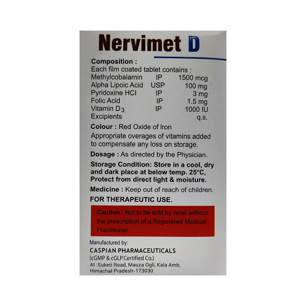 Nervimet D Tablet is a prescription medicine which has a combination of medicine that is used in the treatment of nutritional deficiencies. It contains nutritional supplements that are important for the proper growth and development of the body. Nervimet D Tablet may be taken with or without food. It should be used in the dose and duration as prescribed by your doctor. It is advised to take this medicine at a fixed time.This medicine should not be taken more than the recommended dose. It is usually a safe medicine, however some people may experience diarrhea, nausea, vomiting, and constipation. If you experience any of these side effects which do not resolve on their own or get worse, let your doctor know.Before taking this medicine, tell your doctor if you have any other health conditions. Inform your doctor if you are taking any other medicines or if you are pregnant or breastfeeding. It is advised to avoid alcohol intake while taking this medicine.