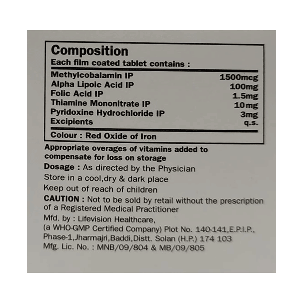 Salt Composition: Methylcobalamin (1500mcg) + Alpha Lipoic Acid (10mcg) + Thiamine mononitrate (10mg) + Pyridoxine Hydrochloride (3mg) + Folic Acid (1.5mg)