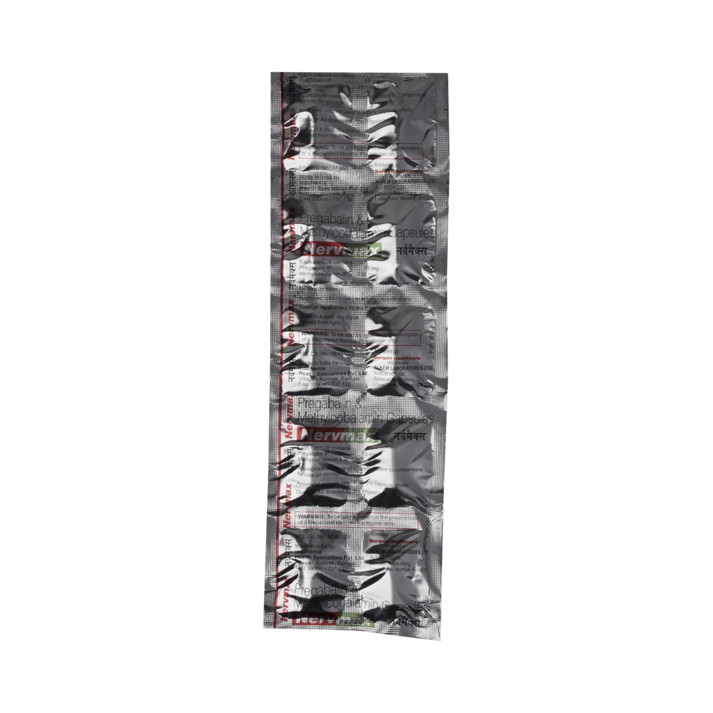 Nervmax Capsule is a prescription medicine used for the treatment of neuropathic pain. It decreases pain by modulating the calcium channel activity of the nerve cells. This medicine also protects nerve fibers and heals damaged nerve cells. Nervmax Capsule may be taken with or without food, preferably at bedtime. It is advised to take it at the same time each day as this helps to maintain a consistent level of medicine in the body. Take this medicine in the dose and duration advised by your doctor. If you miss a dose of this medicine, take it as soon as you remember. Finish the full course of treatment even if you feel better. This medication must not be stopped suddenly without talking to the doctor.Some common side effects of this medicine include nausea, vomiting, diarrhea, constipation, blurred vision, dizziness, and sleepiness. Do not drive or do anything that requires mental focus until you know how this medicine affects you. The side effects are mild and usually improve with time. It may also cause weight gain in some people. Exercise regularly and have a balanced diet to keep your weight in check. Inform your doctor if you develop any unusual changes in mood or behavior, new or worsening depression, or suicidal thoughts.Your doctor should also know about all other medicines you are taking, as many of these may make this medicine less effective or change the way it works. Inform your doctor if you are pregnant, planning pregnancy, or breastfeeding to make sure it is safe for you and the developing baby.