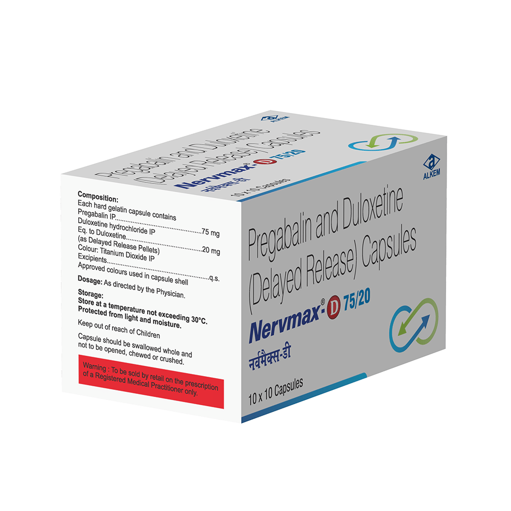 Nervmax-D 75/20 Capsule DR is a combination of two medicines: pregabalin and duloxetine. Pregabalin decreases neurotransmitter release, while duloxetine boosts serotonin and norepinephrine levels to modulate pain perception, working together to relieve nerve pain.