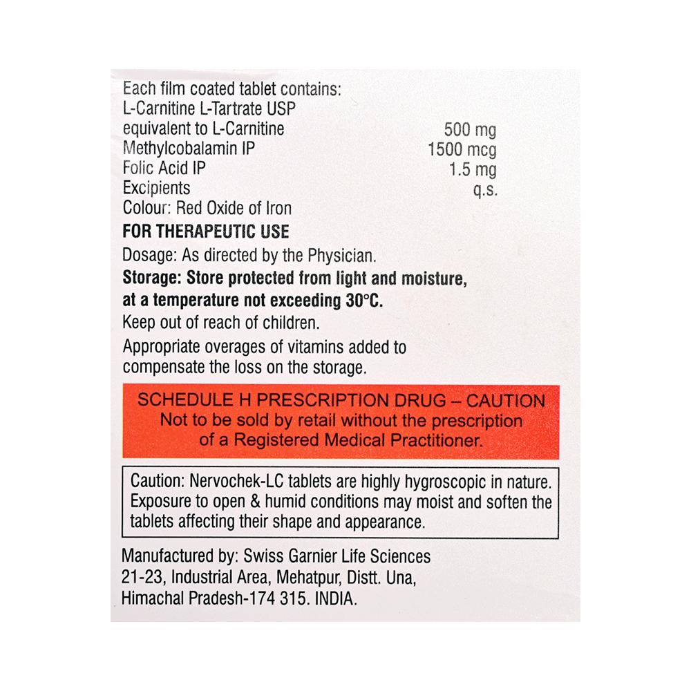 Nervochek LC Tablet is a combination of vitamin B9, B12, L-carnitine L-tartrate. Folic acid is essential for production of red blood cells. It prevents and treats folate deficiency and anemia. When taken by pregnant women, Folic acid prevents miscarriage, preterm labor, and neural tube defects in infants. Levo-carnitine L-tartrate helps turn the fats present in ingested food into energy. It decreases insulin resistance and oxidative stress and improves immune function. Methylcobalamin corrects vitamin B12 deficiency thereby helping in treating certain anemias and nerve problems.