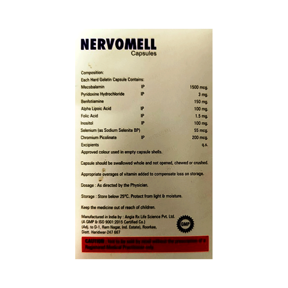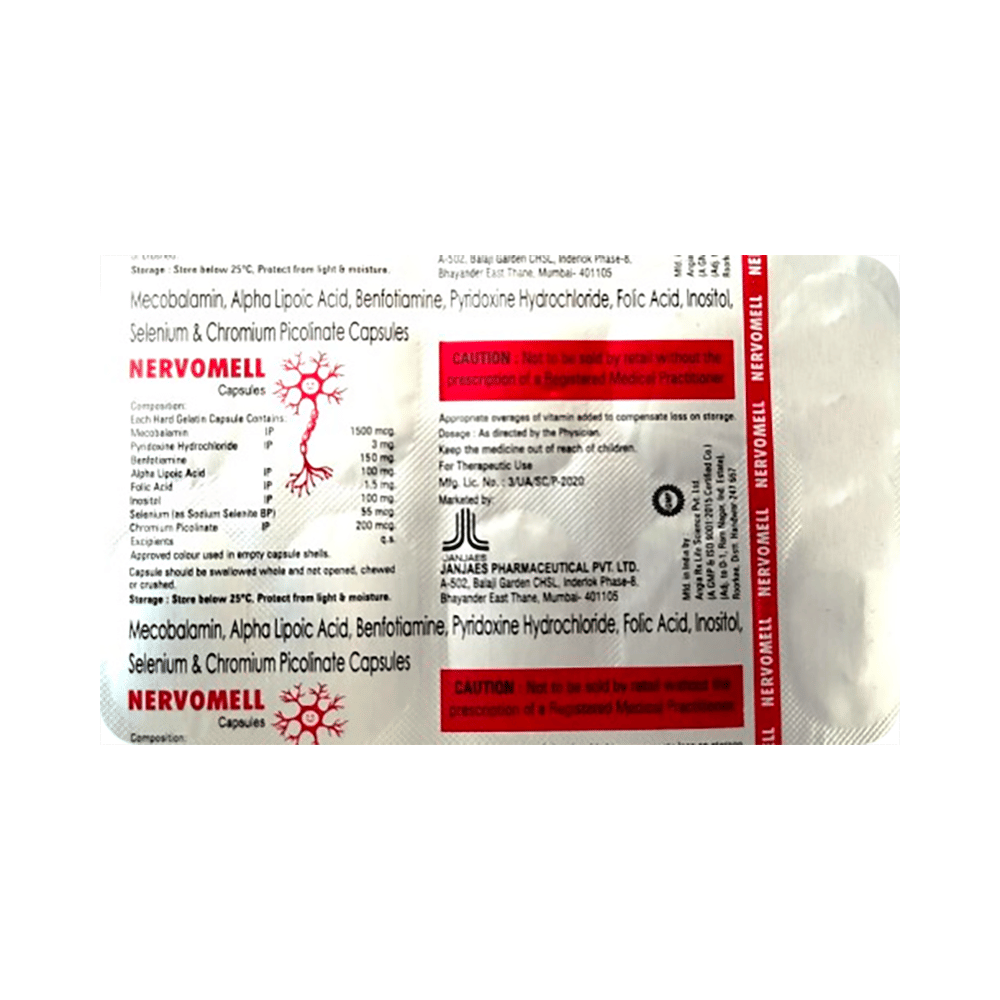 Nervomell Capsule is a combination of vitamins and minerals. Methylcobalamin corrects vitamin B12 deficiency thereby helping in treating certain anemias and nerve problems. Pyridoxine Hydrochloride, a supplement of vitamin B6, is required by your body for utilization of energy in the foods you eat, production of red blood cells, and proper functioning of nerves. Benfotiamine (a form of vitamin B1) treats vitamin B1 deficiency and resulting nerve damage. Alpha-lipoic acid is an antioxidant that protects the brain and nerves from harmful free radicals. It lowers bad cholesterol. It breaks down carbohydrates to make energy. Folic acid is vitamin B9 that is essential for DNA synthesis and cell division. It also supports cardiovascular health and aids in the production of red blood cells. Inositol plays a role in cell signaling, insulin sensitivity, and neurotransmitter function. Selenium prevents cell damage and protects the body from the poisonous effects of heavy metals and other harmful substances. Chromium polynicotinate is composed of chromium and niacin (B3), which helps with the bioavailability and absorption of chromium in the body.