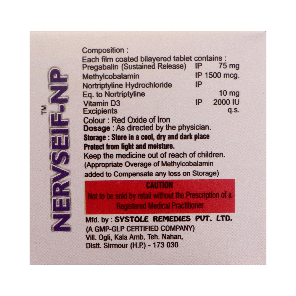 Nervseif-NP Tablet SR combines four medicines: pregabalin, nortriptyline, methylcobalamin, and vitamin D3. Pregabalin is an alpha-2 delta ligand that decreases pain by modulating the calcium channel activity of the nerve cells. Nortriptyline is a tricyclic antidepressant that increases the levels of chemical messengers (serotonin and noradrenaline) that stop the movement of pain signals in the brain. Methylcobalamin is a form of vitamin B that helps produce myelin, a substance that protects nerve fibers and rejuvenates damaged nerve cells. Vitamin D3 helps nerves send messages properly in the body. It supports brain chemicals, protects nerve coverings, and reduces swelling, which keeps nerves healthy and helps relieve pain. Together, they relieve neuropathic pain (pain from damaged nerves).