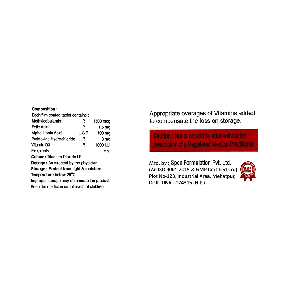Salt Composition: Methylcobalamin (1500mcg) + Alpha Lipoic Acid (100mg) + Vitamin B6 (Pyridoxine) (3mg) + Folic Acid (1.5mg) + Vitamin D3 (1000IU)