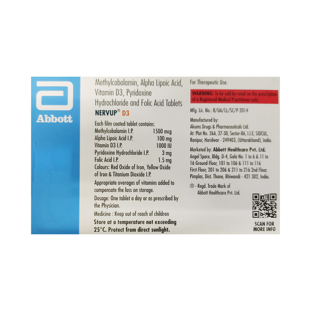 Nervup D3 Tablet is a prescription medicine which has a combination of medicine that is used in the treatment of nutritional deficiencies. It contains nutritional supplements that are important for the proper growth and development of the body. Nervup D3 Tablet may be taken with or without food. It should be used in the dose and duration as prescribed by your doctor. It is advised to take this medicine at a fixed time.This medicine should not be taken more than the recommended dose. It is usually a safe medicine, however some people may experience diarrhea, nausea, vomiting, and constipation. If you experience any of these side effects which do not resolve on their own or get worse, let your doctor know.Before taking this medicine, tell your doctor if you have any other health conditions. Inform your doctor if you are taking any other medicines or if you are pregnant or breastfeeding. It is advised to avoid alcohol intake while taking this medicine.