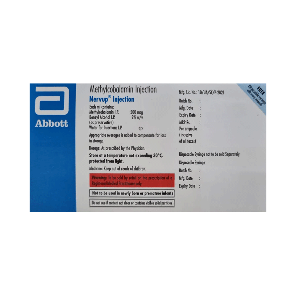 NervUP Injection is a man-made form of vitamin B12. It is used to treat deficiency of vitamin B12 in the body. Vitamin B12 is important for growth, cell reproduction, blood formation, and protein and tissue synthesis. It also helps to treat anemia, fatigue, and numbness or tingling in the hands and feet. NervUP Injection should be used exactly as prescribed by the doctor. Follow all directions on the prescription label and read all medication guides before use. You should use it regularly and at a fixed time each day to get the most benefit from it. This medicine may be only part of a complete program of treatment that also includes making changes to your diet and taking other medicines and supplements. Learn about the foods you should eat to make sure you get enough vitamin B12 in your diet.NervUP Injection is generally safe and does not usually cause any common side effects. Some medicines can decrease the absorption of vitamin B12, let your doctor know all other medicines you are taking to make sure you are safe. To make sure it is safe for you, before using the medicine let your doctor also know if you have any medical conditions such as Leber's disease, liver disease, or kidney disorder.