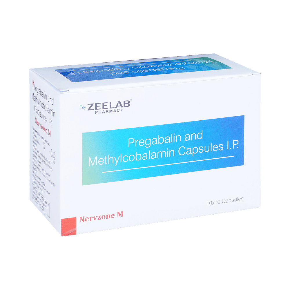 Nervzone-M Capsule is a prescription medicine used for the treatment of neuropathic pain. It decreases pain by modulating the calcium channel activity of the nerve cells. This medicine also protects nerve fibers and heals damaged nerve cells. Nervzone-M Capsule may be taken with or without food, preferably at bedtime. It is advised to take it at the same time each day as this helps to maintain a consistent level of medicine in the body. Take this medicine in the dose and duration advised by your doctor. If you miss a dose of this medicine, take it as soon as you remember. Finish the full course of treatment even if you feel better. This medication must not be stopped suddenly without talking to the doctor.Some common side effects of this medicine include nausea, vomiting, diarrhea, constipation, blurred vision, dizziness, and sleepiness. Do not drive or do anything that requires mental focus until you know how this medicine affects you. The side effects are mild and usually improve with time. It may also cause weight gain in some people. Exercise regularly and have a balanced diet to keep your weight in check. Inform your doctor if you develop any unusual changes in mood or behavior, new or worsening depression, or suicidal thoughts.Your doctor should also know about all other medicines you are taking, as many of these may make this medicine less effective or change the way it works. Inform your doctor if you are pregnant, planning pregnancy, or breastfeeding to make sure it is safe for you and the developing baby.