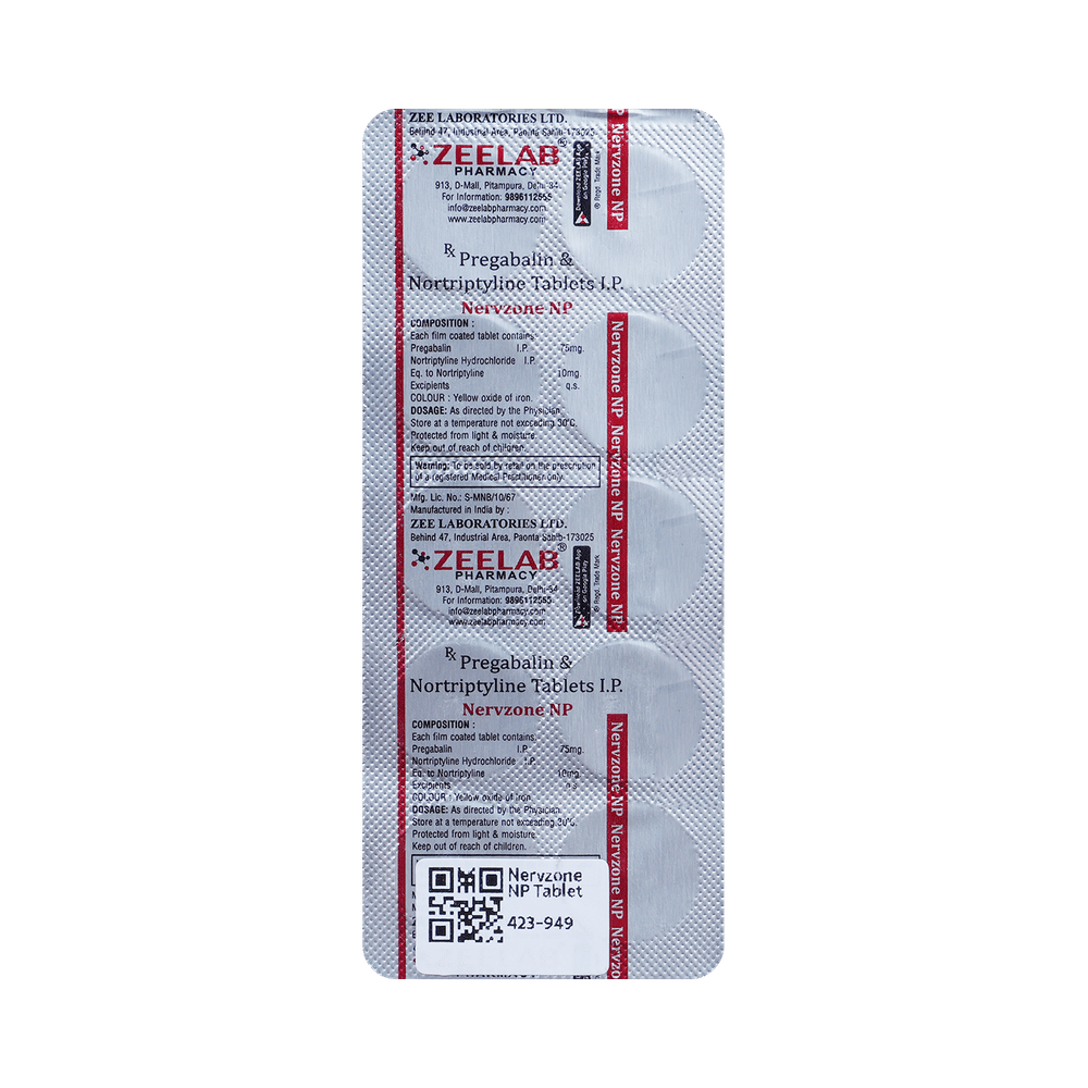 Nervzone NP Tablet is a combination of two medicines: Pregabalin and Nortriptyline. Pregabalin is an alpha-2 delta ligand that decreases pain by modulating the calcium channel activity of the nerve cells. Nortriptyline is a tricyclic antidepressant that increases the levels of chemical messengers (serotonin and noradrenaline) that stop the movement of pain signals in the brain. Together, they relieve neuropathic pain (pain from damaged nerves).