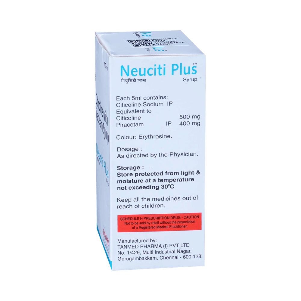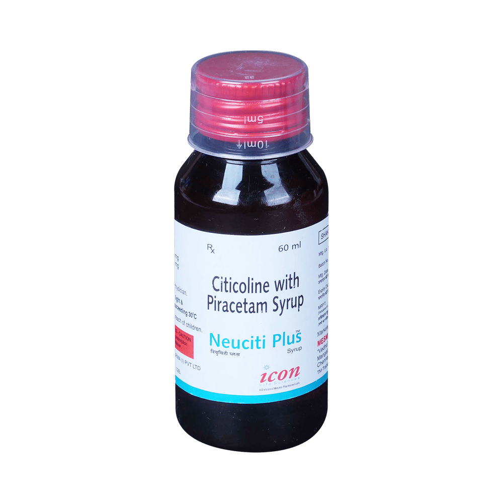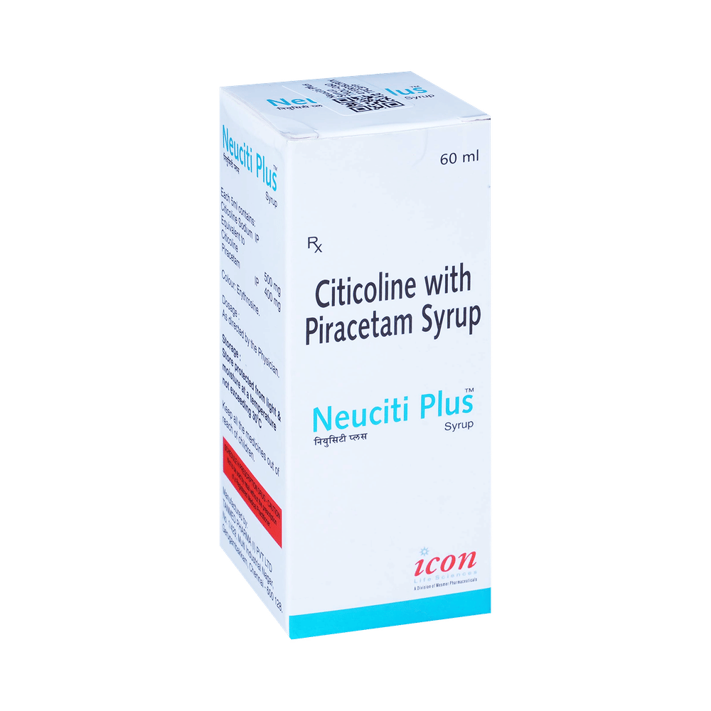 Neuciti Plus Syrup is a medicine used in stroke rehabilitation and as a cognitive enhancer. It protects the nerve cells in the brain from damage and also helps to repair the damaged nerve cells. It may also be used in the treatment of brain trauma. Neuciti Plus Syrup may be taken with or without food, preferably at the same time each day. Take it at the same time each day as this helps to maintain a consistent level of medicine in the body. Take this medicine in the dose and duration as advised by your doctor and if you have missed a dose, take it as soon as you remember it. Do not skip any doses and finish the full course of treatment even if you feel better. It is important that this medication is not stopped suddenly without talking to your doctor as it may worsen your symptoms.Some common side effects of this medicine include hyperactivity, stomach pain, nervousness, and decreased blood pressure. However, these are temporary and usually resolve on their own. Please consult your doctor if these do not subside or bother you. Drink plenty of fluids to keep yourself hydrated while taking this medicine as this medicine may cause diarrhea. This medicine may cause weight gain and to control it, you should have a balanced diet and exercise regularly.