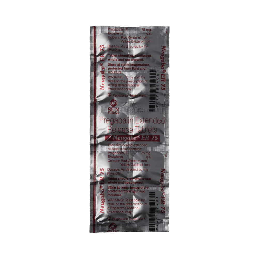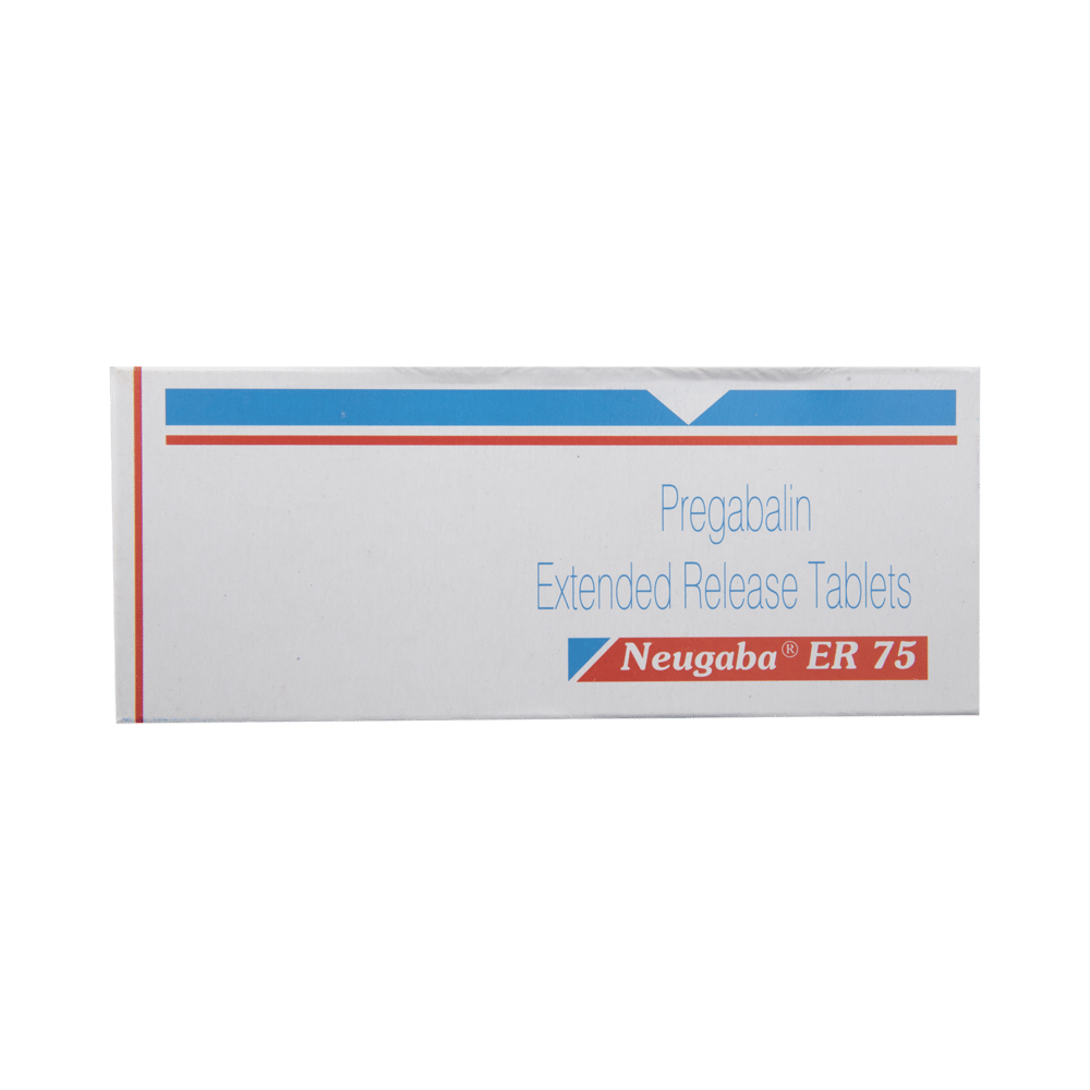 Neugaba ER 75 Tablet is a medicine used to relieve pain caused by nerve damage (neuropathic pain) due to diabetes, shingles (herpes zoster infection), spinal cord injury, or other conditions. It is also used to treat widespread muscle pain and stiffness in people with fibromyalgia. Neugaba ER 75 Tablet belongs to the anti-epileptic group of medicines and can also be used to treat certain types of seizures (fits) in combination with other medicines. Additionally, it may also be prescribed to treat the symptoms of anxiety disorder if other medicines are not suitable.You can take Neugaba ER 75 Tablet with or without food, but it is important to take this medicine at the same time each day to get the most benefit. The exact dose and duration of treatment will depend on your condition and how you respond to it. Your doctor will probably start this medicine at a low dose and increase it gradually. It may take a few weeks for the medicine to work properly. Follow your doctor’s instructions and continue taking it regularly until your doctor advises you to stop. Do not miss any dose, otherwise, your condition may worsen.The side effects of this medicine are usually mild and go away by themselves. The most common ones are feeling sleepy or dizzy, dryness in the mouth, blurred vision, weight gain, edema (swelling over the whole body), and difficulty in concentrating. Most side effects are not serious and do not need medical attention. Talk to your doctor about potential side effects and ways in which you might prevent or cope with them.Before taking the medicine you should tell your doctor if you are pregnant, breastfeeding, or planning to become pregnant. Be careful while driving as sleepiness, dizziness, and blurring of vision may be seen as side effects. You should avoid drinking alcohol along with this medicine as it may lead to excessive sleepiness and dizziness.