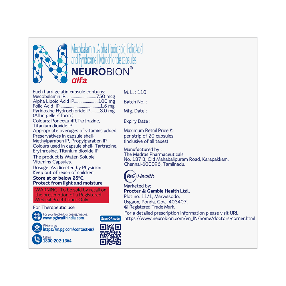 Neurobion Alfa Capsule is a combination of four nutritional supplements:Methylcobalamin, Alpha Lipoic Acid, Vitamin B6 (Pyridoxine) and Folic Acid which replenish the body's stores of important nutrients.
