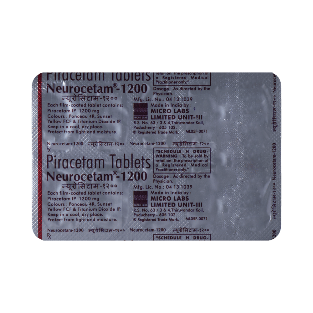 Neurocetam 1200 Tablet is used in the treatment of memory loss in Alzheimer's disease. It can also be used to treat age-related and post-traumatic memory loss. It works by improving communication between the nerve cells and protects the brain. Neurocetam 1200 Tablet is sometimes used to help manage sickle cell disease. It can reduce the number of painful episodes called vaso-occlusive crises by improving blood flow and preventing blood cells from sticking together.Neurocetam 1200 Tablet should be taken by mouth with or without food. It is advisable to take this medicine at the same time each day to maintain a consistent level in the blood. Do not skip any doses and finish the full course of treatment even if you feel better. This medication mustn't be stopped suddenly, as it may result in twitching or jerking movements, and even relapse of the disease may occur.Some common side effects of this medicine include nervousness and abnormality of voluntary movements. It may also cause dizziness and sleepiness, so do not drive or do anything that requires mental focus. This medicine may cause weight gain; therefore, you should have a balanced diet and exercise regularly.This medicine can affect platelet aggregation, so inform your doctor if you have bleeding problems or if you are on medications that help make blood thin. Pregnant and breastfeeding women should consult their doctors before taking this medicine.