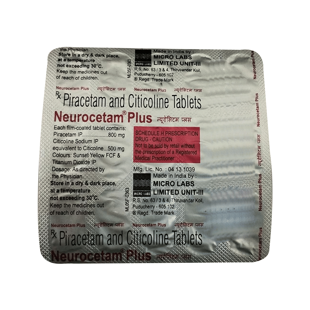 Neurocetam Plus Tablet is a combination of two medicines: Citicoline and Piracetam. Citicoline is a nerve protecting medicine. It works on the brain by nourishing the nerve cells, protects them from damage and improves their survival. Piracetam is a GABA (gamma amino butyric acid) analogue. It works by protecting the brain and nervous system against shortness of oxygen and also affects various ion channels on nerve cell membrane.