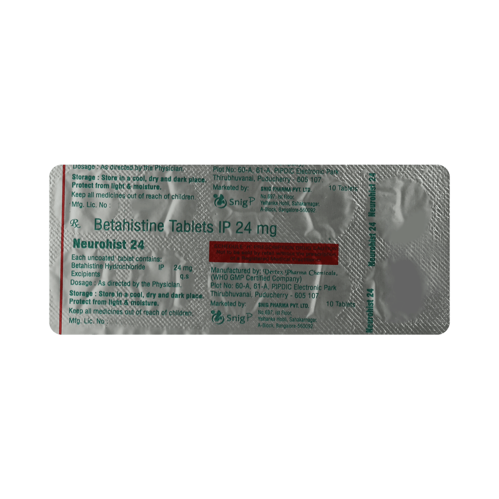 Neurohist 24mg Tablet is used to prevent and treat a disorder of the inner ear known as Ménière’s disease. The symptoms include dizziness (vertigo), ringing in the ears (tinnitus), and loss of hearing, probably caused by fluid in the ear. This medicine helps relieve the symptoms by reducing the amount of fluid. Neurohist 24mg Tablet should be swallowed whole with water and taken at the same time(s) each day to get the most benefit. Your doctor will decide what is the correct dose to relieve your symptoms and how often you need to take it. You may need to take this medicine for several months and you should take it for as long as prescribed by your doctor, even if you start feeling better. The most common side effects include headache, feeling sick, and indigestion (dyspepsia). You may also get stomach pain and bloating. Taking the medicine with food can help reduce stomach problems.  Before taking this medicine, you should talk to your doctor if you have a stomach ulcer, asthma, or high or low blood pressure. You must also tell him/her what other medicines you are taking, to make sure you are safe. Also speak to your doctor if you are pregnant, trying to become pregnant, or breastfeeding.