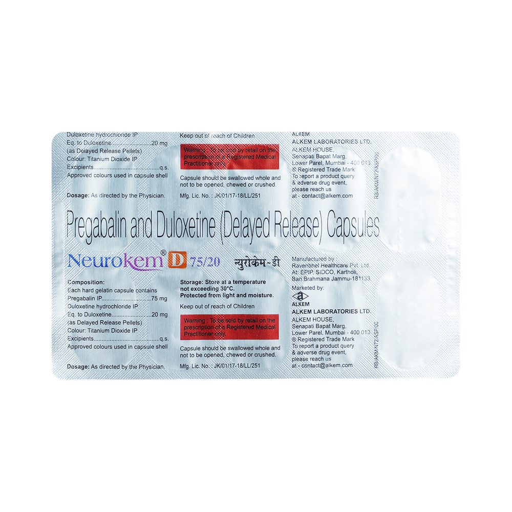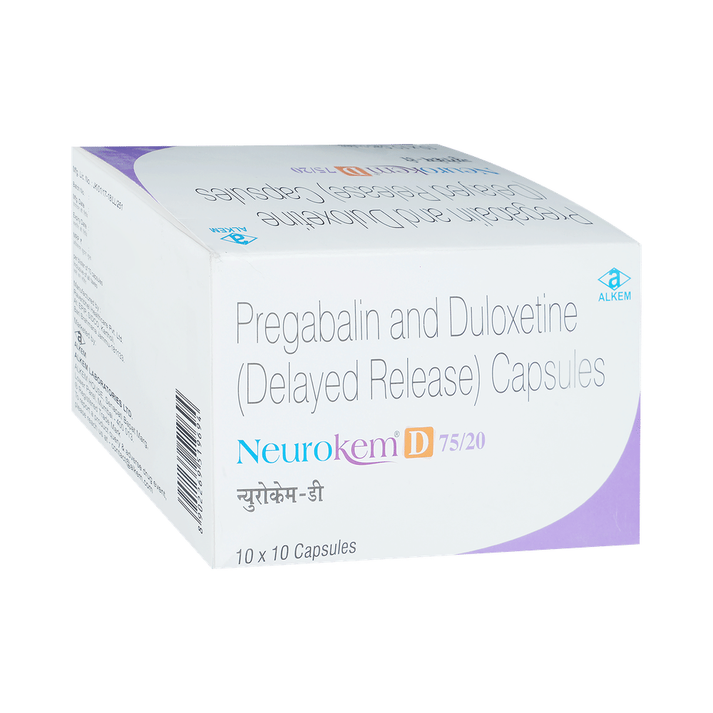 Neurokem D 75mg/20mg Capsule is a combination of two medicines: pregabalin and duloxetine. Pregabalin decreases neurotransmitter release, while duloxetine boosts serotonin and norepinephrine levels to modulate pain perception, working together to relieve nerve pain.